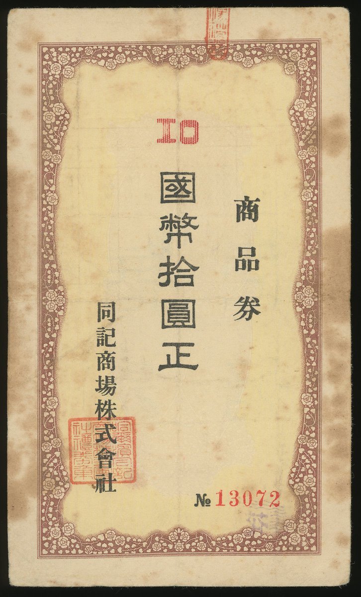 Private Issue, group of 4, consisting of: Tong Ji Mall, Harbin, 10 yuan commodity coupon, number 13072, with a Manchurian government revenue stamp 5 fen on reverse bottom left, also Yong Shun company, 3x 1 tiao, 1928, serial number 0729-31,