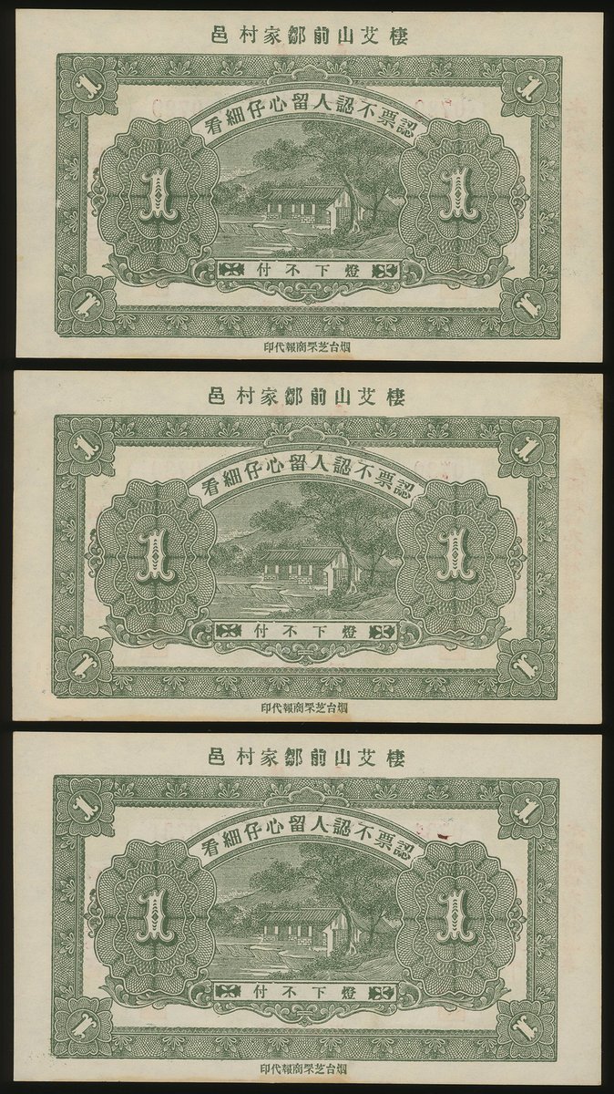 私鈔一組4枚,包括哈爾濱同記商場商品券10元,以及1928年永順公司1吊三枚,首枚GVF品相,有污漬,其後三枚UNC,印刷精美,紙邊有微黃