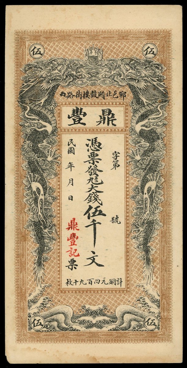 Private Bank: Ding Feng, 5000 cash, unissued remainder, almost uncirculated, defective lower left corner