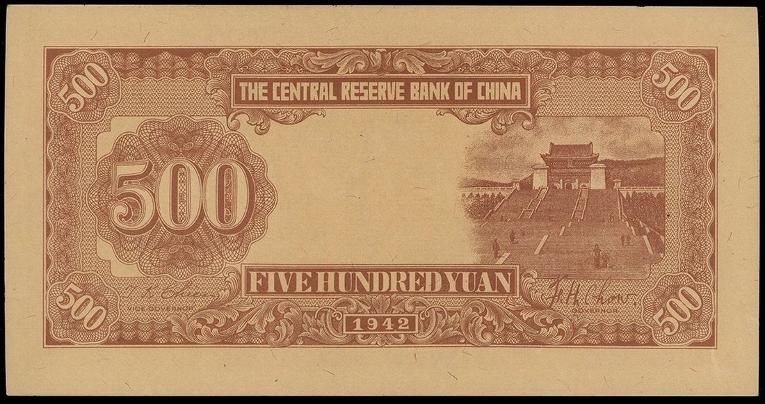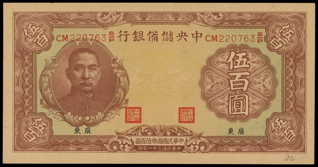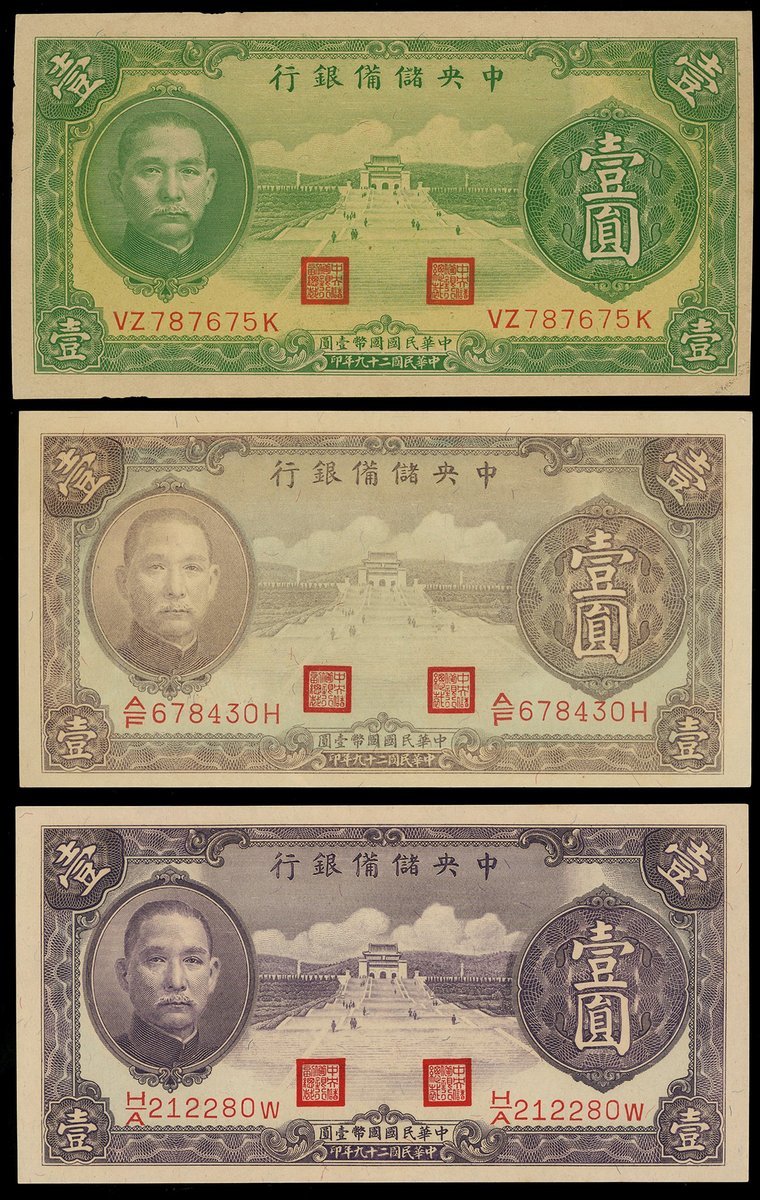 The Central Reserve Bank of China, group of 4 notes, 1 yuan, 3 different colour varieties, 500 yuan, with 'Kwangtung' overprinted in black,