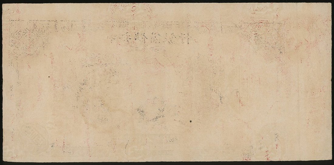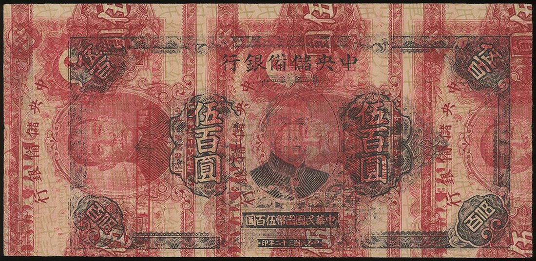 Central Reserve Bank of China, uniface 5/500 Yuan error note, 1940/1943, seems to be the case where a vertically printed red 5 Yuan uncut sheet of 3 was overprinted horizontally with a black 500 Yuan,
