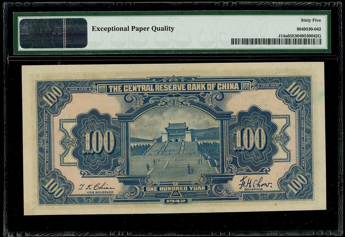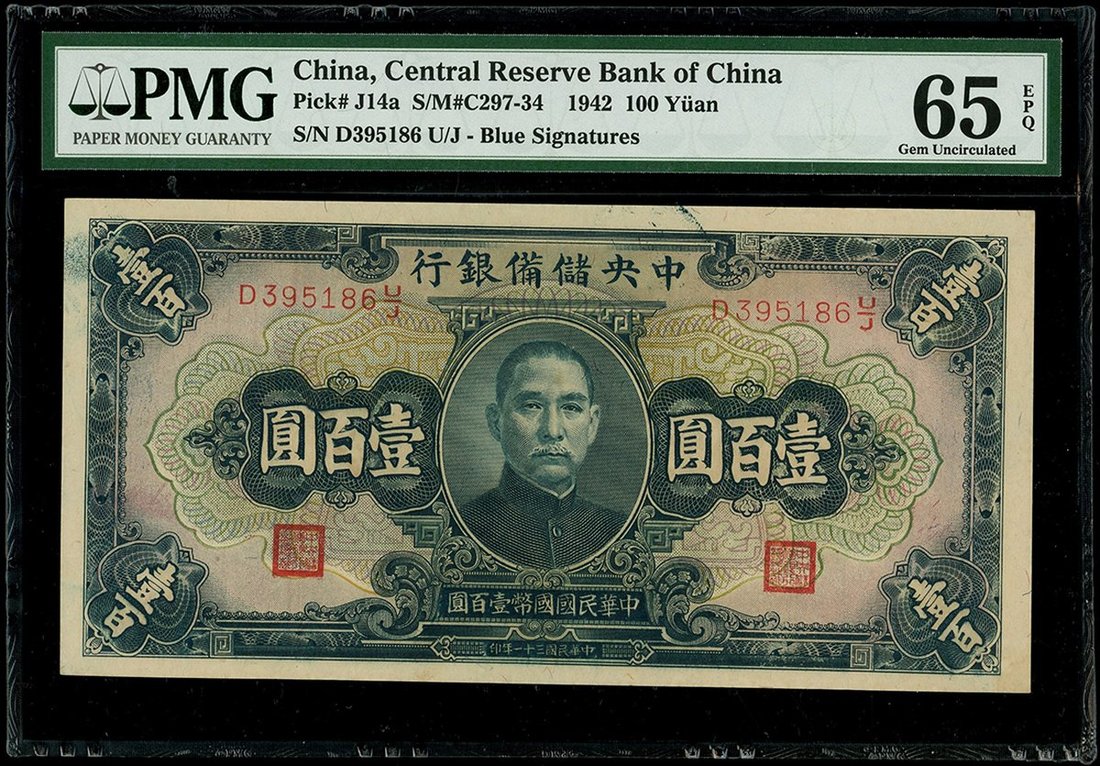 The Central Reserve Bank of China, 100 Yuan, 1942, serial number D395186 U/J, (Pick J14a), PMG 65EPQ Gem Uncirculated