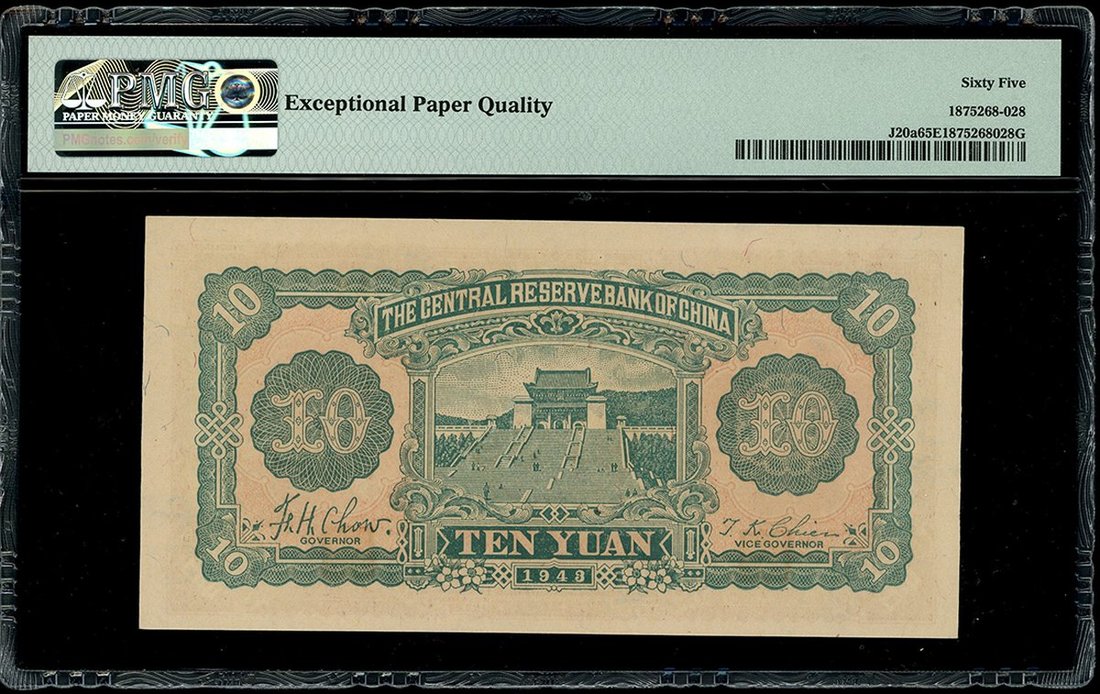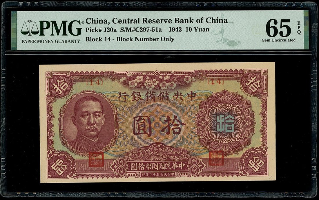 The Central Reserve Bank of China, 10 Yuan, 1943, block serial number 14, (Pick J20a), PMG 65EPQ Gem Uncirculated