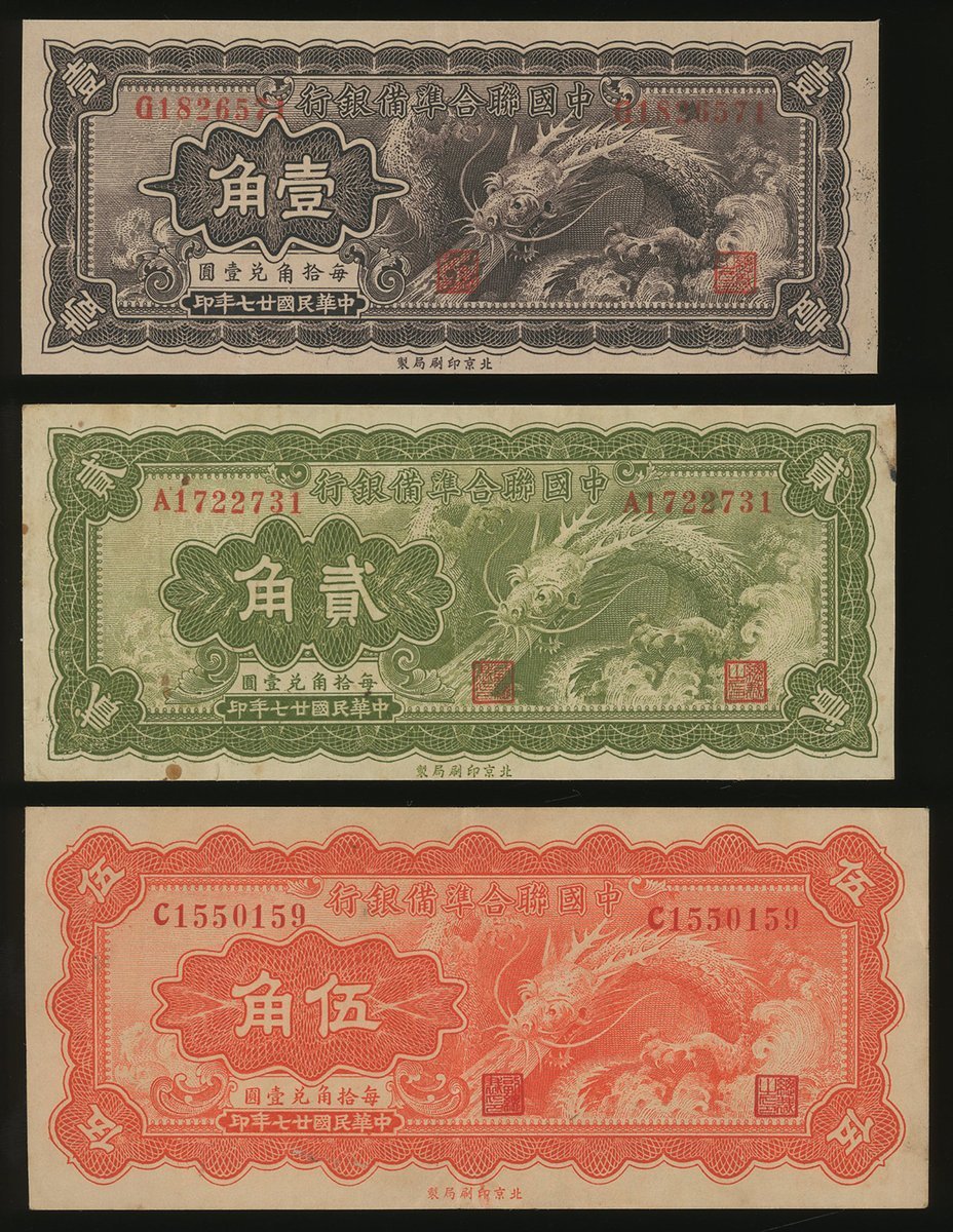民國廿七年中國聯合準備銀行1、2及5角,編號G1826571, A1722731 及 C1550159,VF至EF