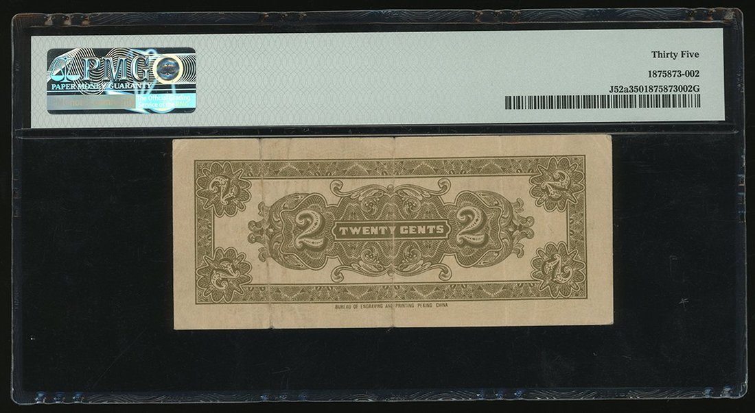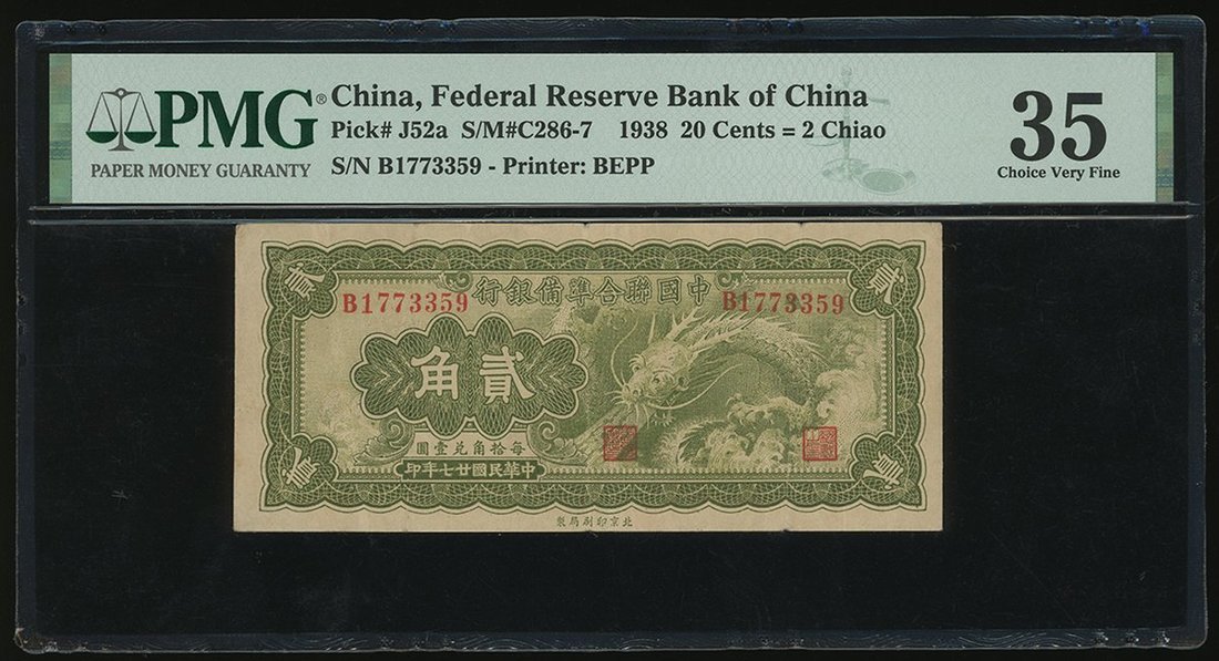 The Federal Reserve Bank of China, 20 cents, 1938, serial number B1773359, (Pick J52a), PMG 35 Choice Very Fine