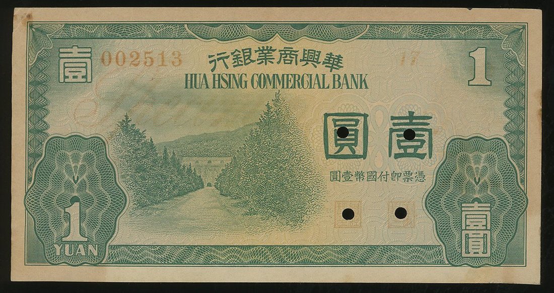 Hua Hsing Commercial Bank, 1 yuan, 1938, perforated specimen, serial number 002513, green and yellow,