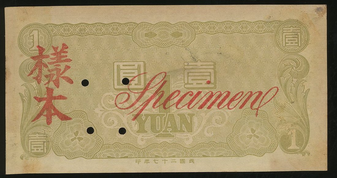 1938年華興商業銀行1元樣票,編號002513,有黃及褪色,GEF,罕見