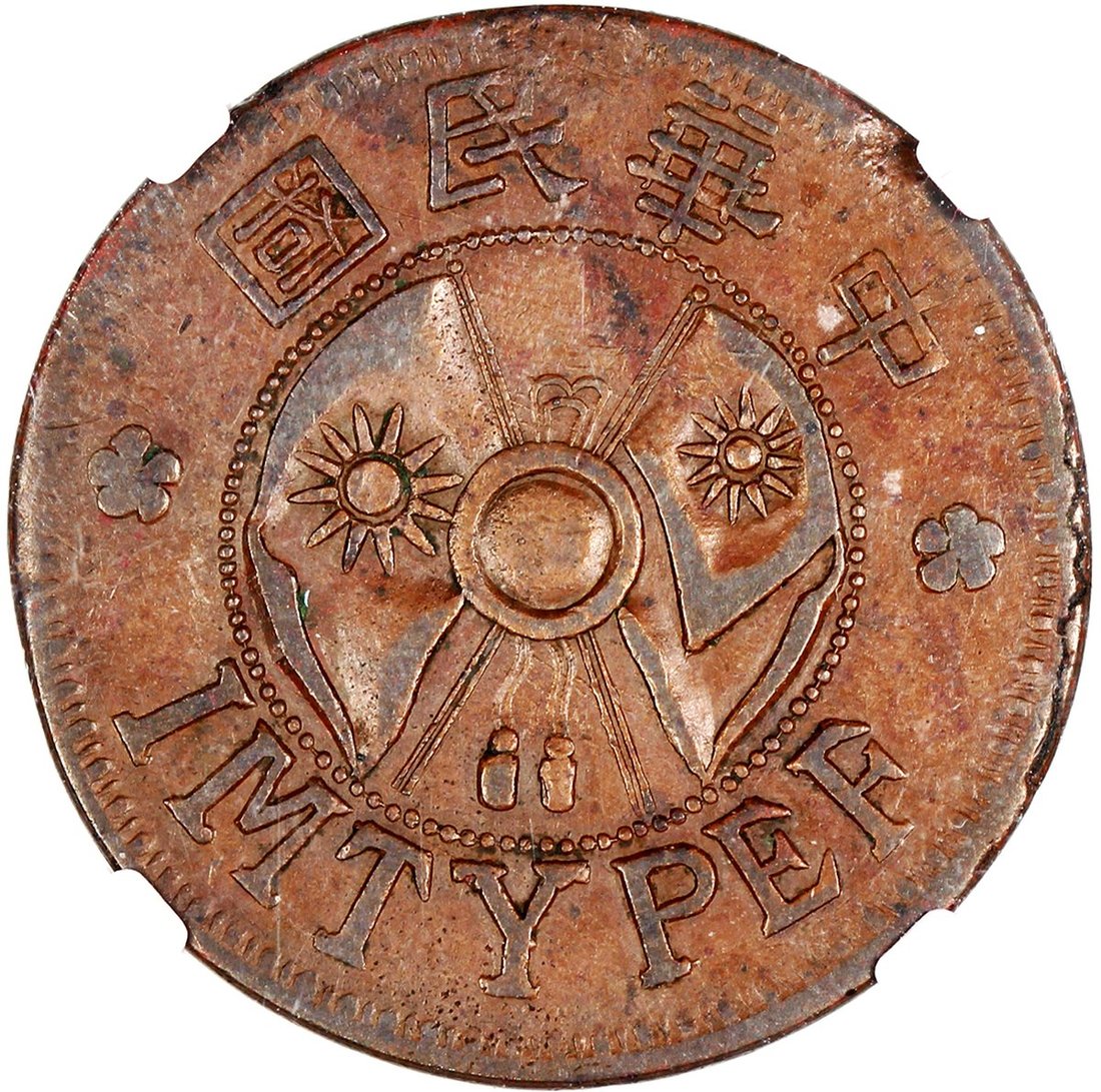 Shensi Province, copper 2 fen, 1928, crossed flags at obverse, 31.8x1.7mm, 11.0g,