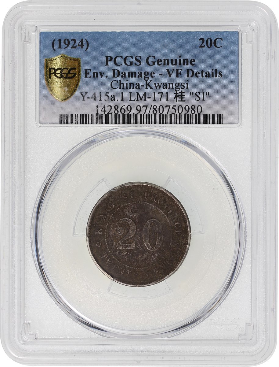 Kwangsi Province, silver 20 cents, Year 13(1924), with small Chinese character 'Gui' at centre on reverse, (LM-171), PCGS VF Detail, environmental damage.