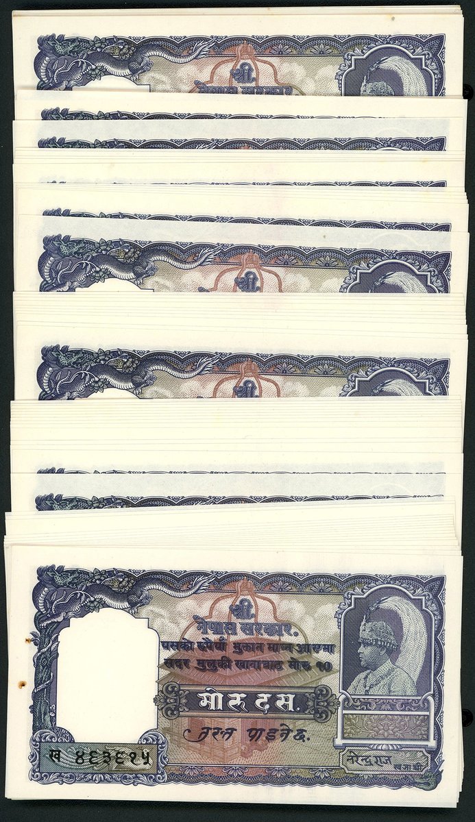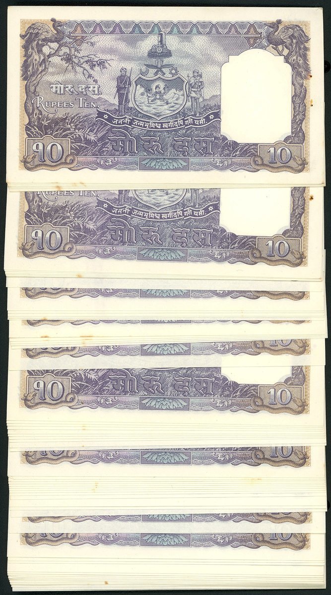 Nepal, group of 70x 10 Mohru, ND (1951), type II heading, mostly consecutive serial numbers 493615-493699, missing 44-46, 54-55, 81-89 and 91, signed by Narendra Raj Pandit,