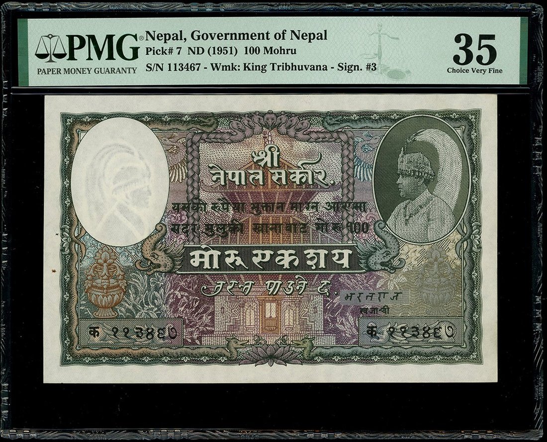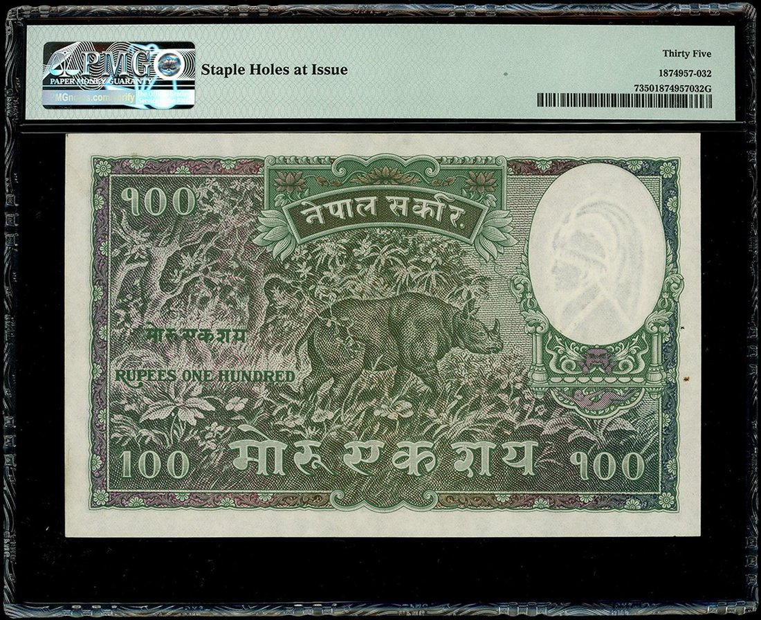 1951年尼泊爾100盧比,編號11346,無日期,PMG 35,有釘孔,罕見早期票,PMG誤標Pick號為7,實為3號