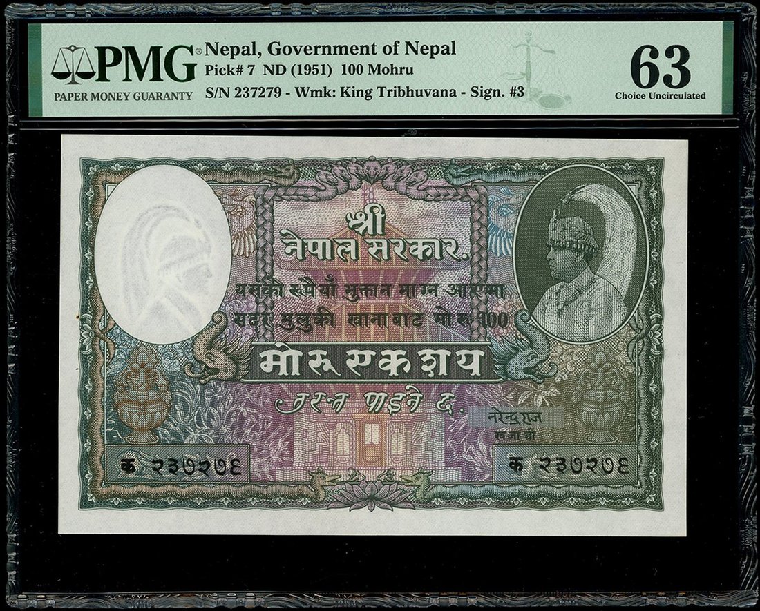 Nepal, 100 Mohru, ND (1951), serial number 237279, type II heading, signed by Narendra Raja,