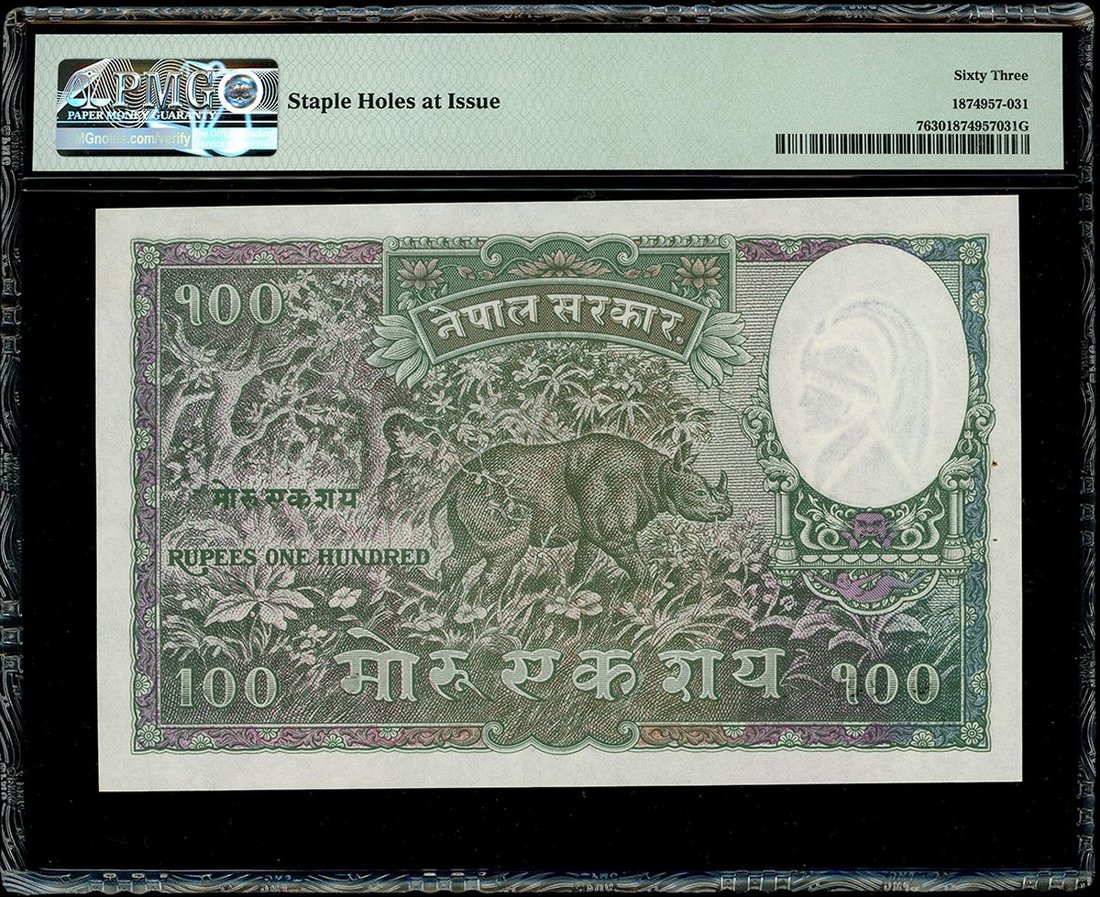 1951年尼泊爾100盧比,無日期,編號237279,PMG 63,有釘孔