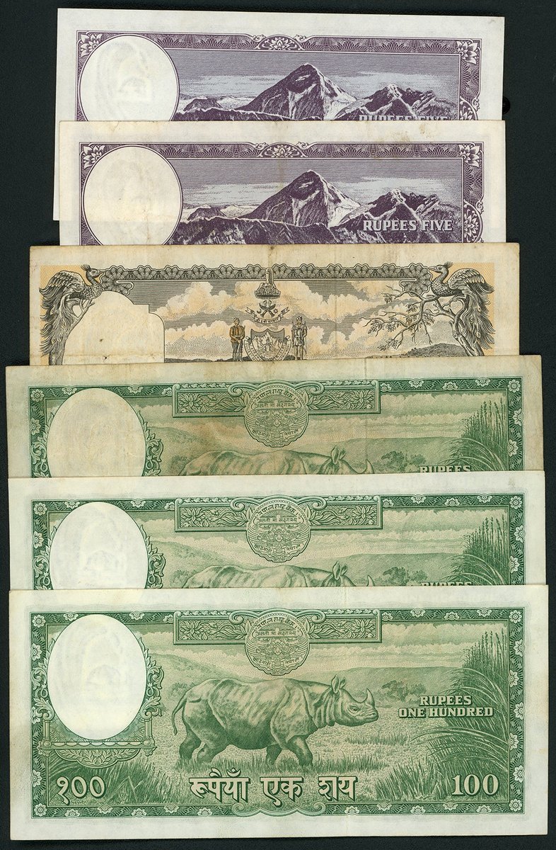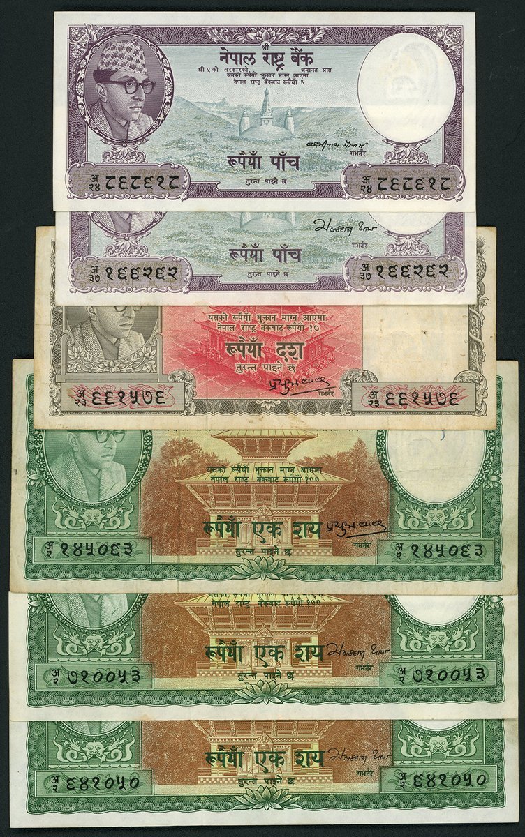 1961-65年尼泊爾盧比一組6枚,不同簽名版別,5盧比2枚,10盧比一枚,及100盧比3枚,F至EF