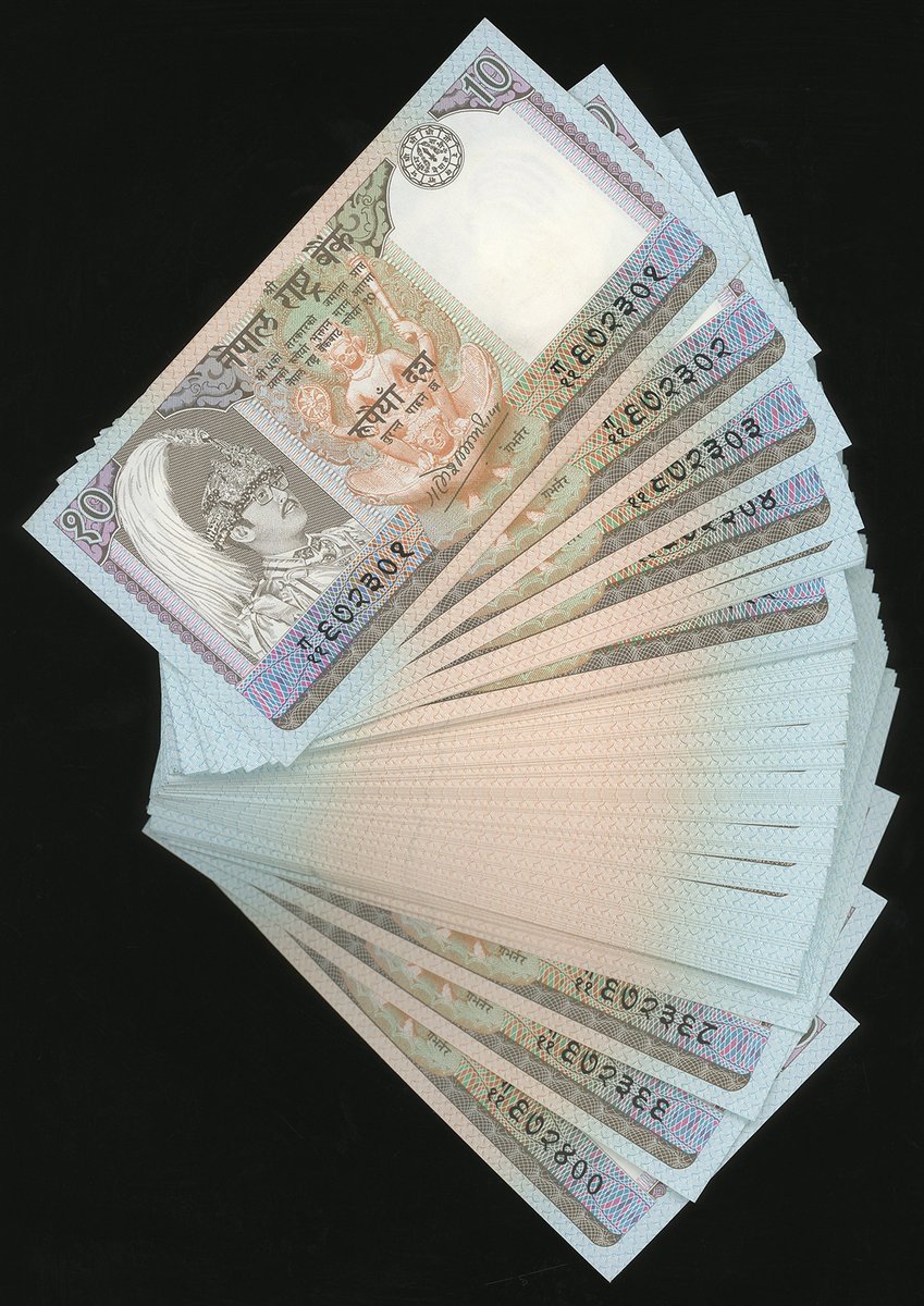 Nepal, a near-consecutive run of 98x 10 Rupees, ND (1985-1987), serial number 972301-400, missing 334 and 335, signed by Ganesh Bahadur Thapa,