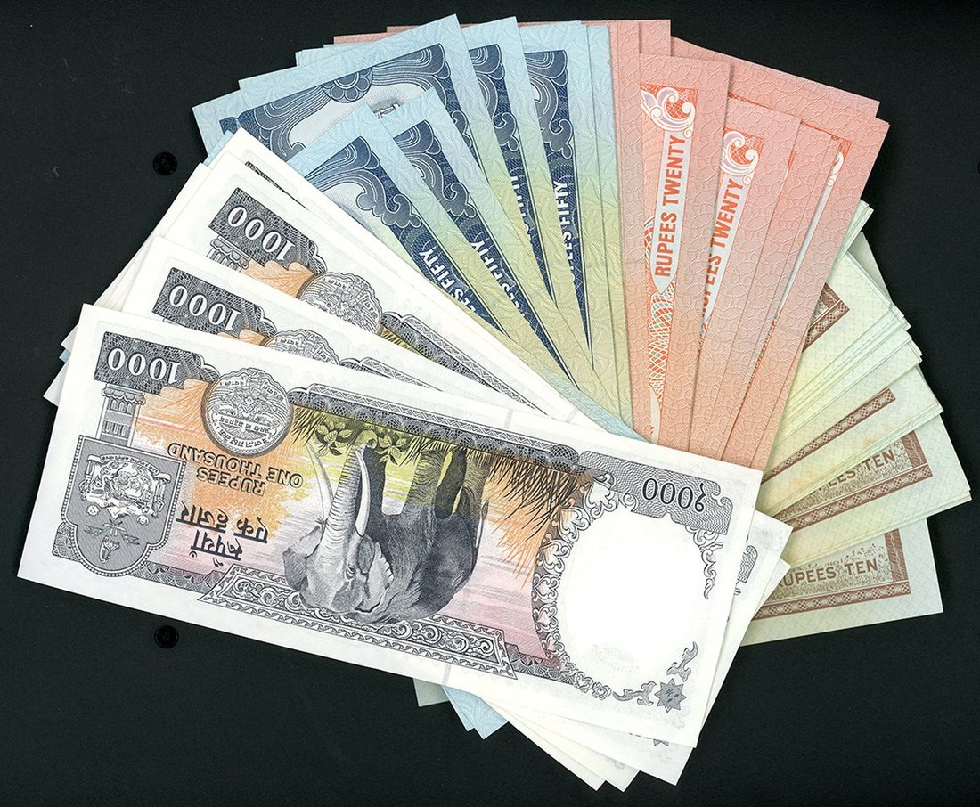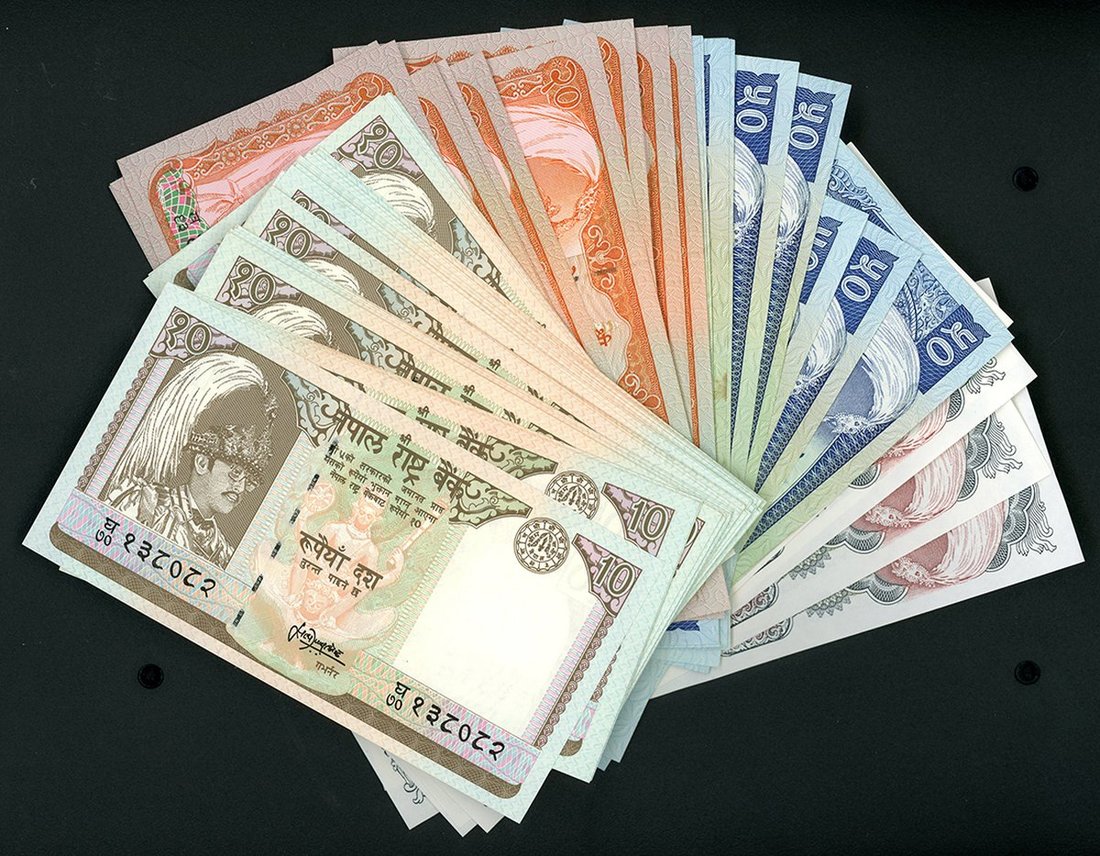 尼泊爾一組84枚,包括1981-87年Shrestha簽名10盧比44枚、50盧比15枚、1000盧比6枚,連號713883-713888,1988-95年20盧比19枚,10盧比EF至AU,帶微黃,其餘AU至UNC