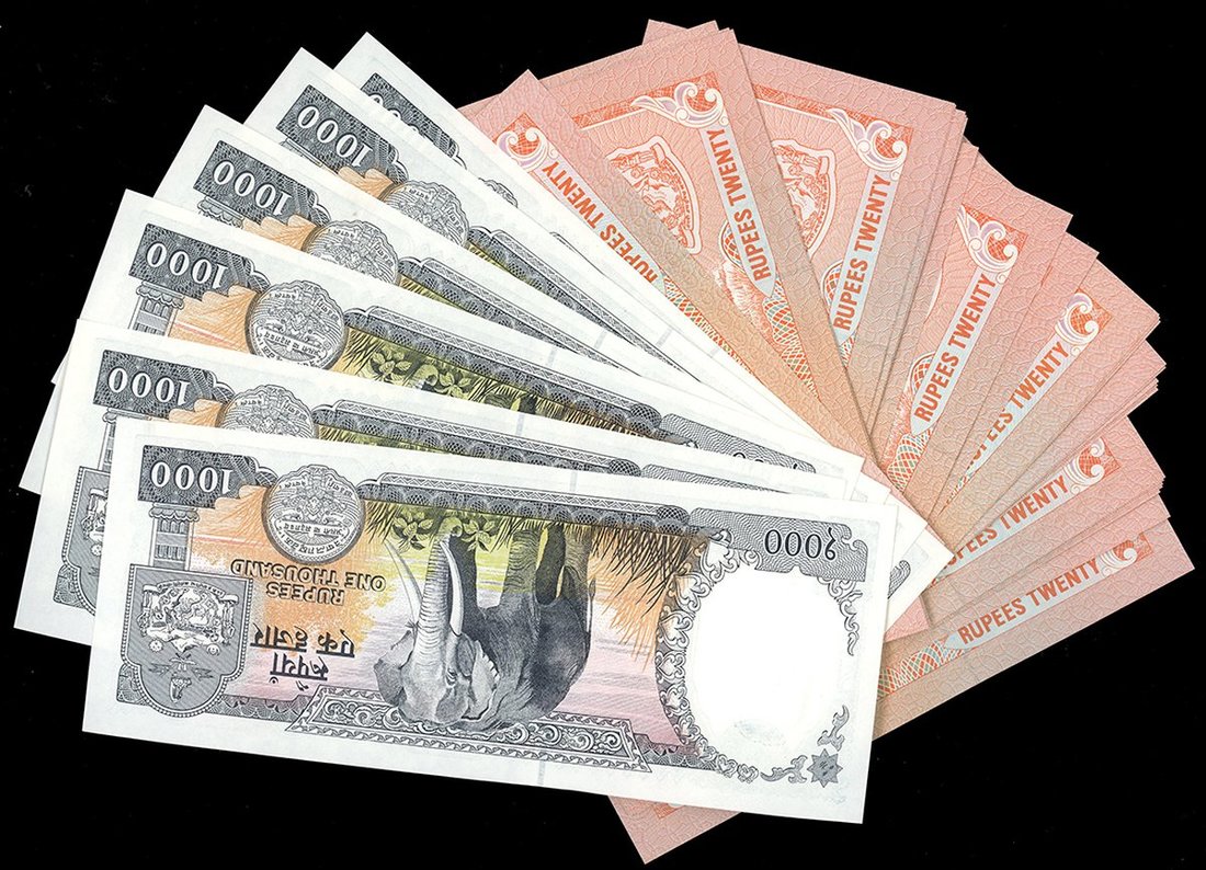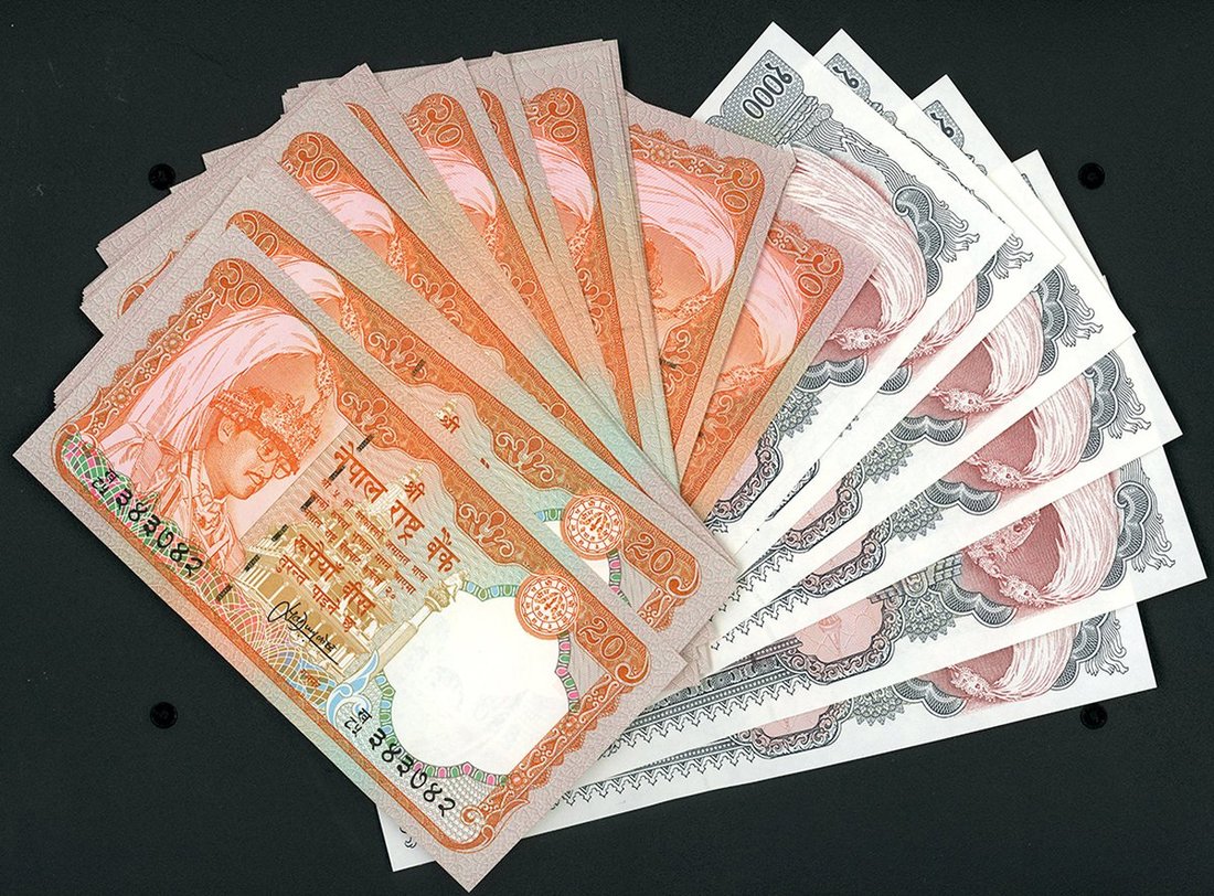 1988-96年尼泊爾一組38枚,無日期,Tripathi簽名,包括20盧比32枚,若干為連號,1000盧比6枚,大部分UNC品相