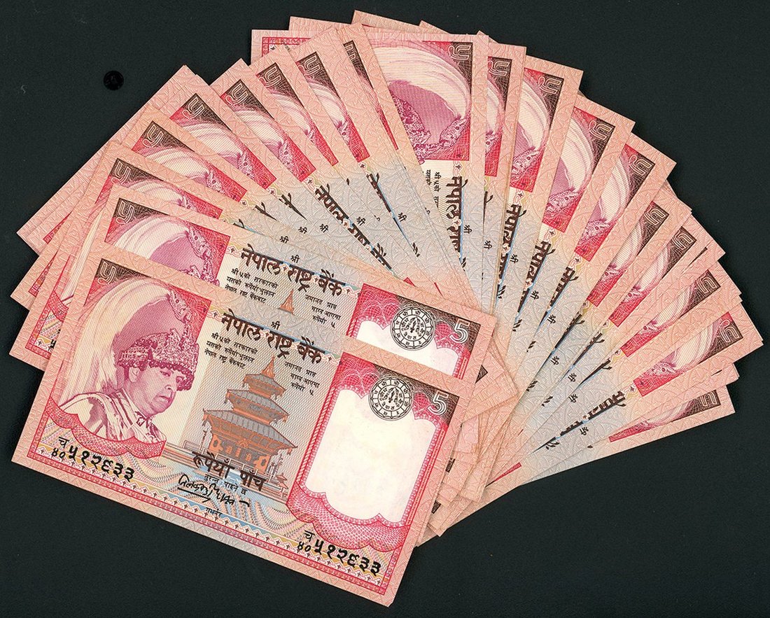 2005年尼泊爾5盧比一組50枚,若干為連號,全部Dr. Rawal簽名,大多AU至UNC品相,少部分VF至EF