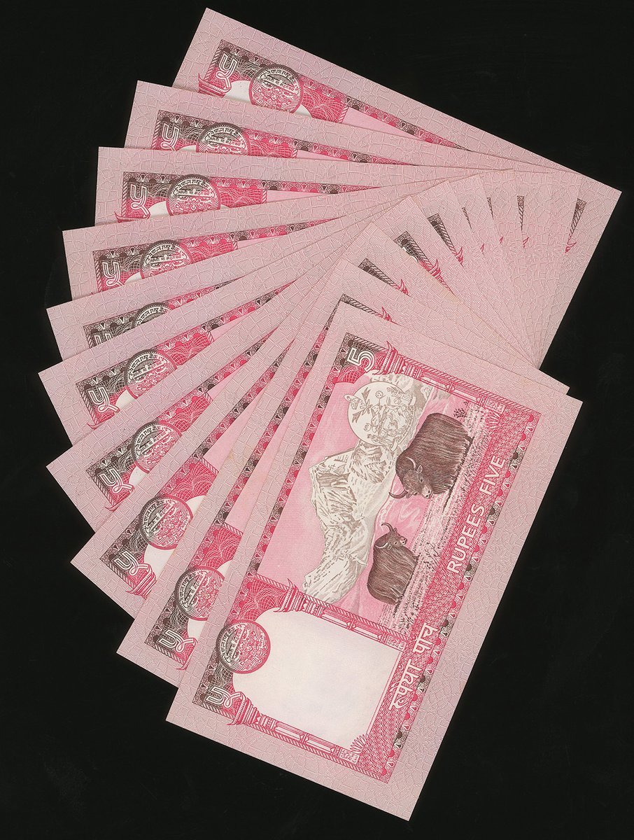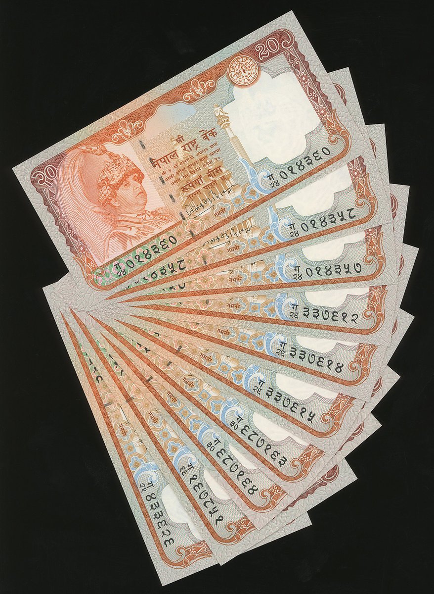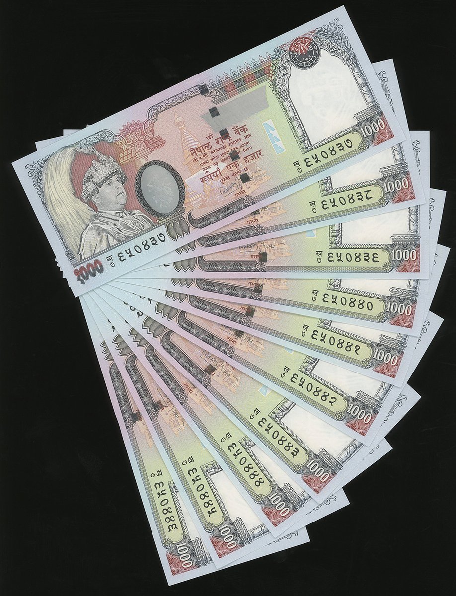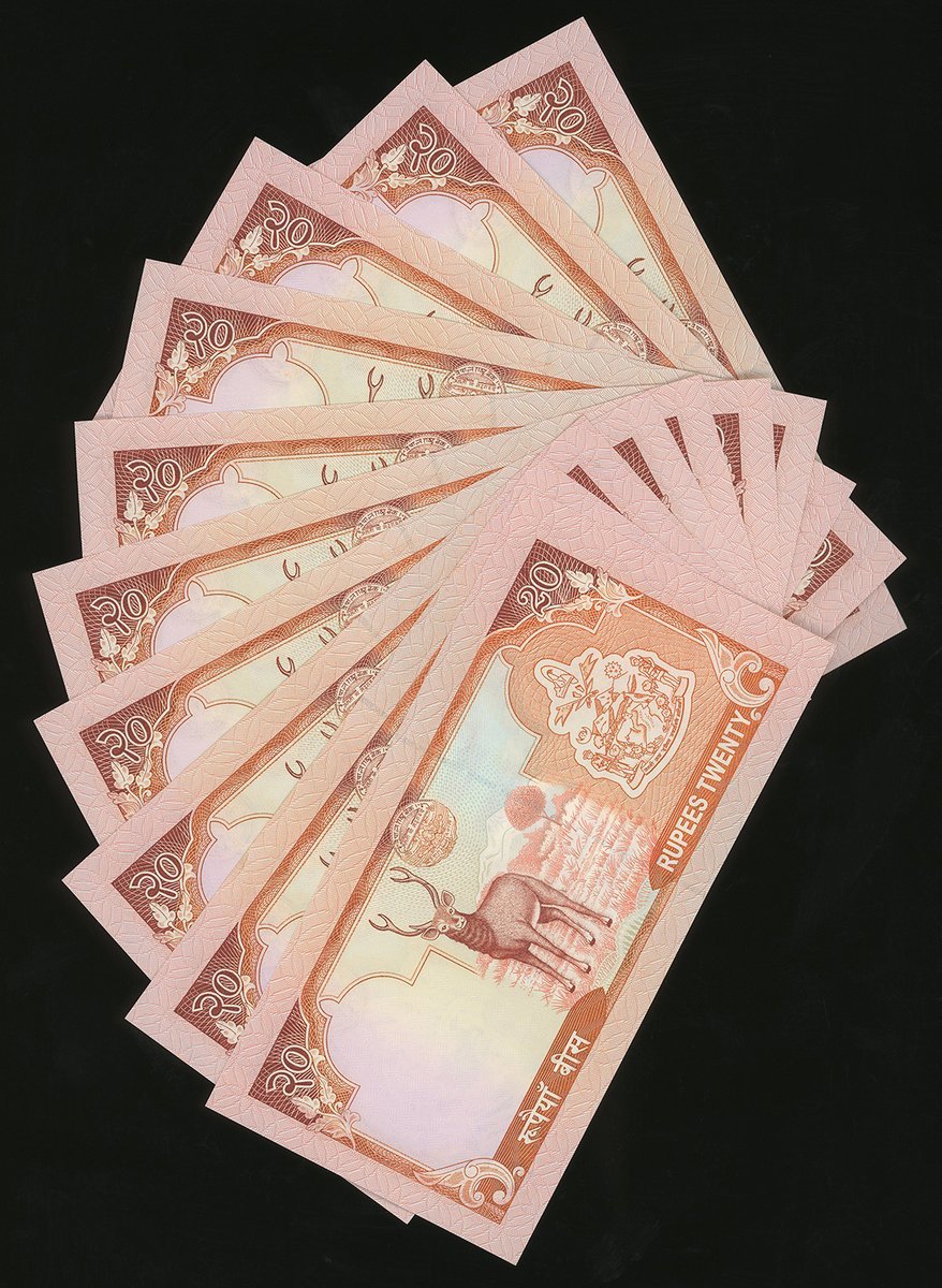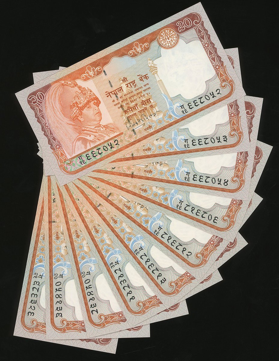 2002-05及2005-06年尼泊爾紙鈔一組60枚,不同簽名版別,5盧比20枚,20盧比20枚及1000盧比20枚,若干連號,UNC,有軟折