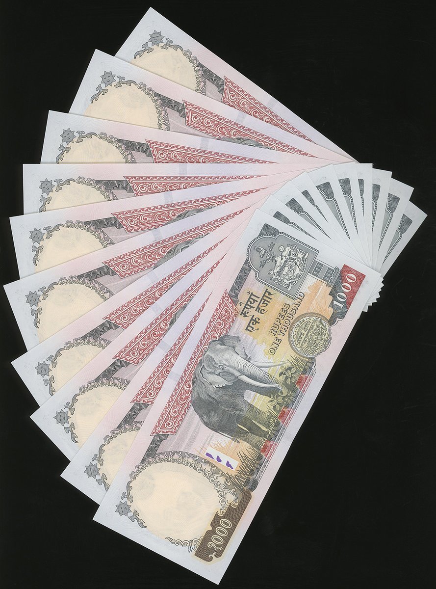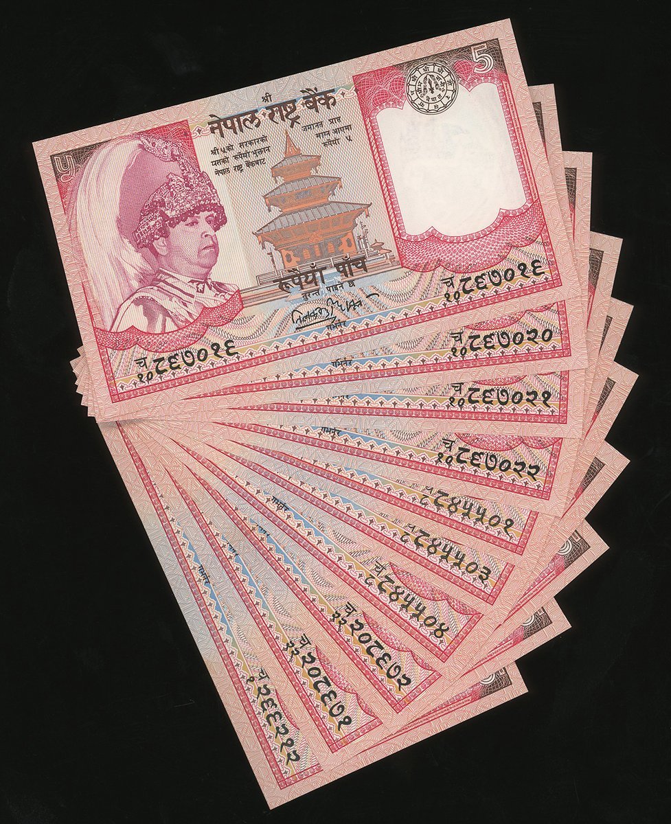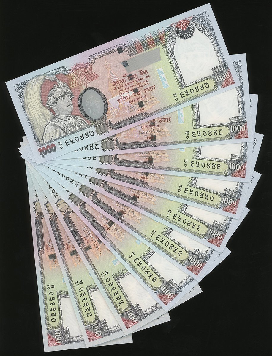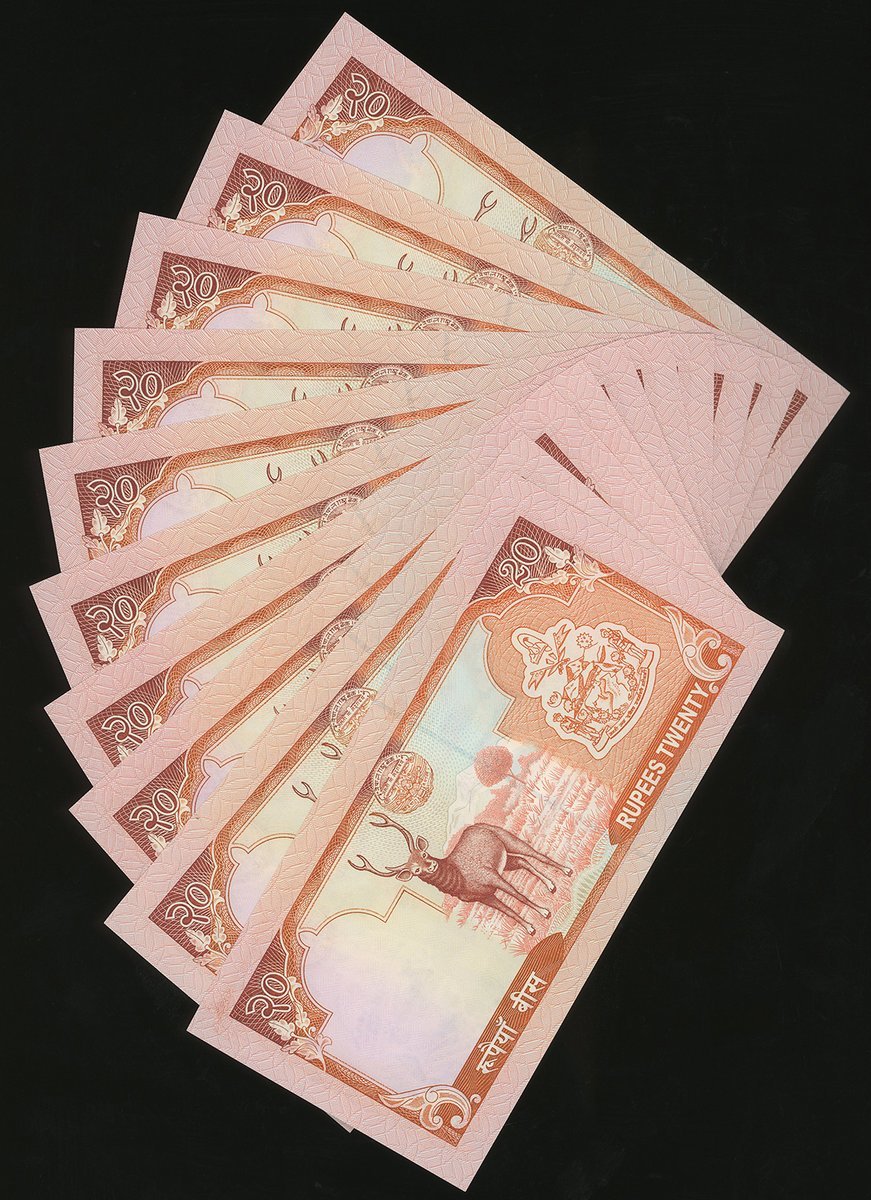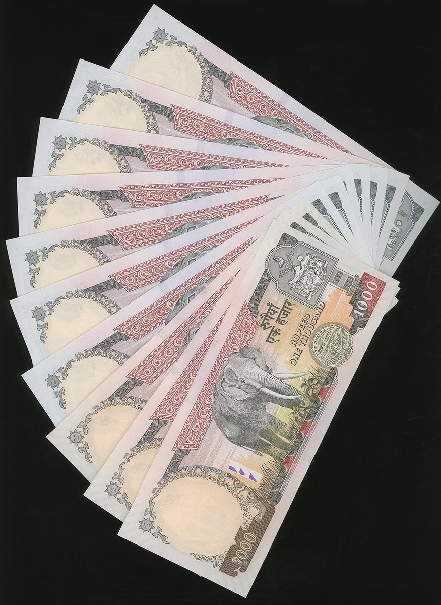 2002-05及2005-06年尼泊爾紙鈔一組60枚,不同簽名版別,5盧比20枚,20盧比20枚及1000盧比20枚,若干連號,UNC,有軟折