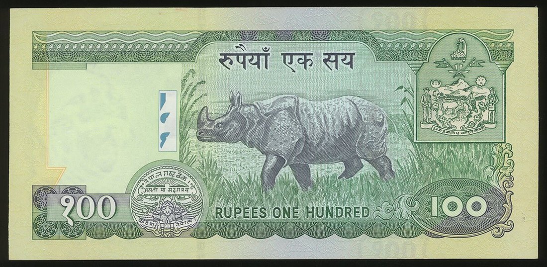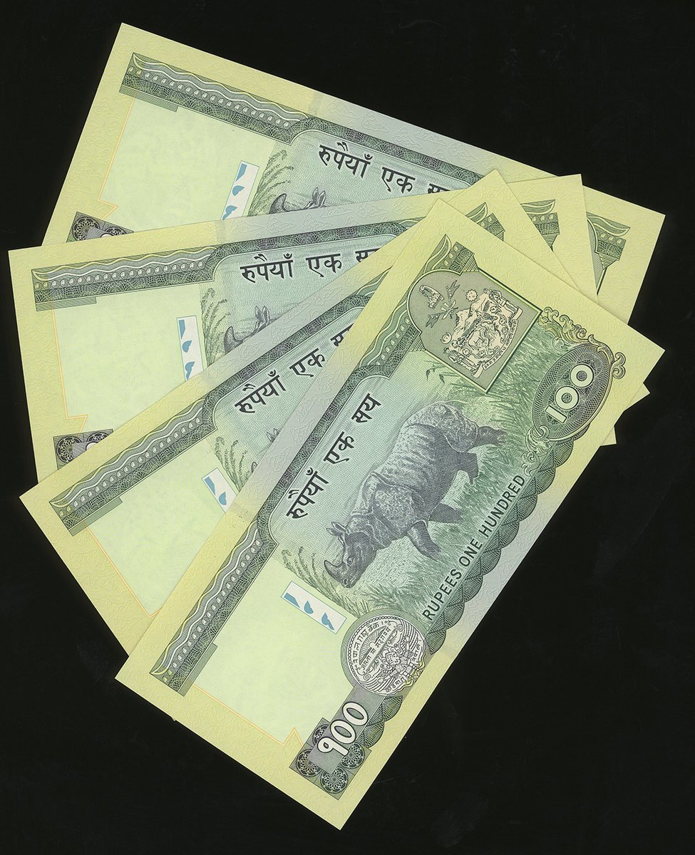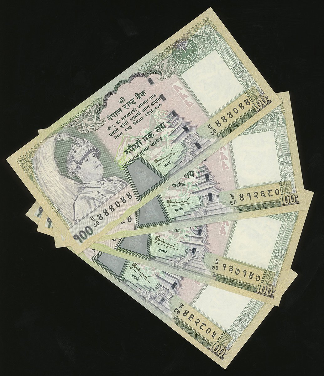 5x 100 Rupees, signed by Dr. Rawal (1) and Bhattarai (4), including near-solid serial number 444044,