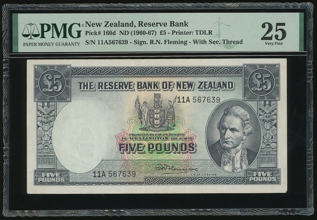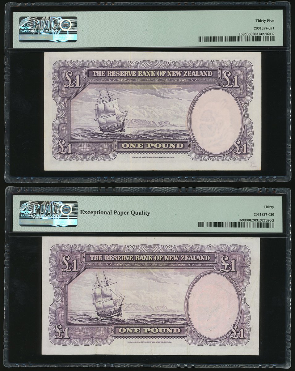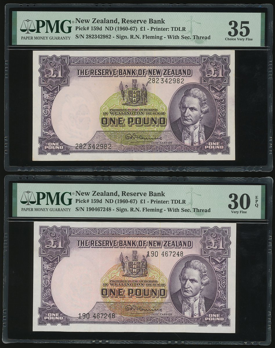 1960-67年新西蘭1鎊2枚及5鎊,編號282342982, 190467248 及 11A567639,Flemming簽名,分別評PMG 35, 30EPQ 及 25