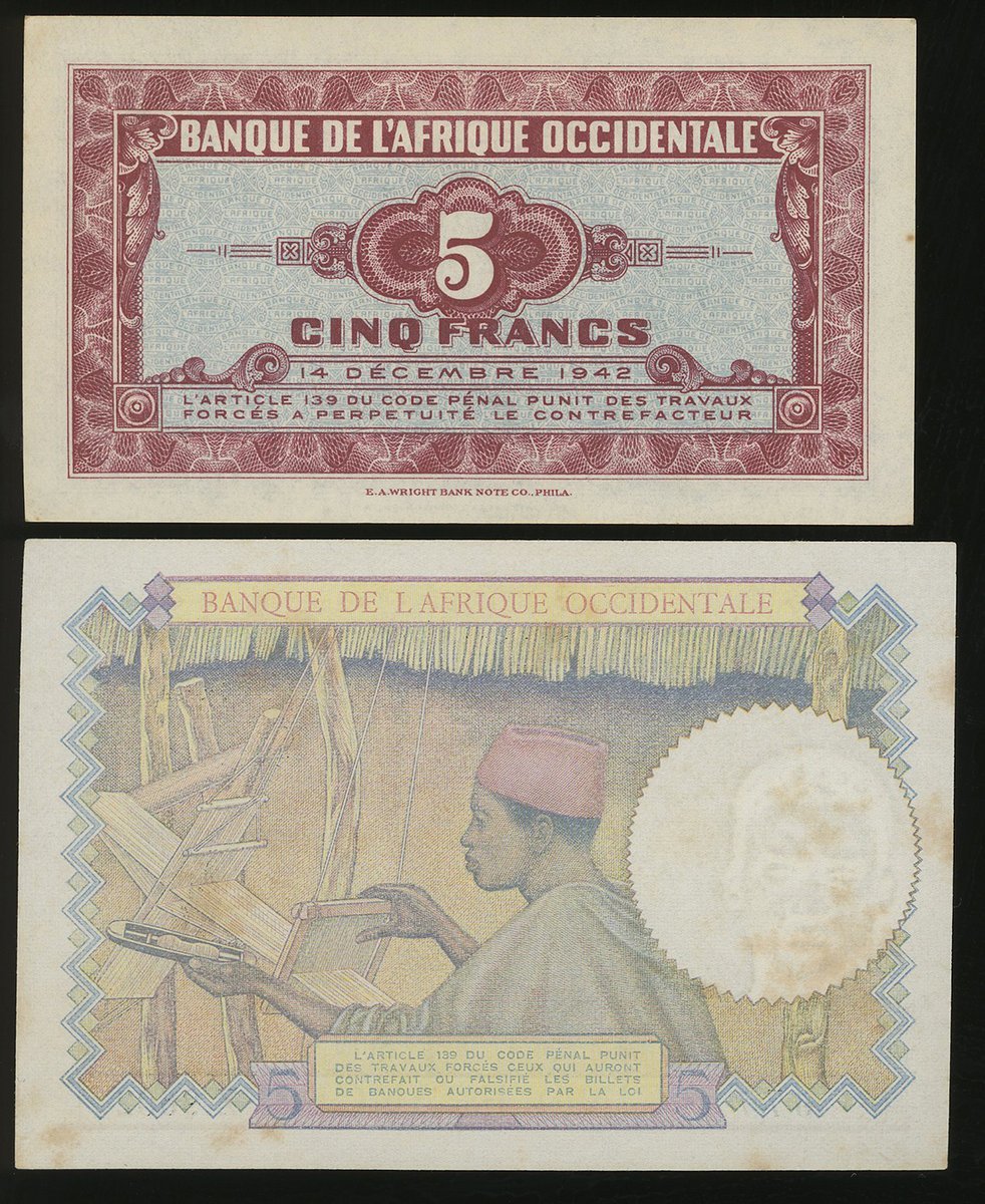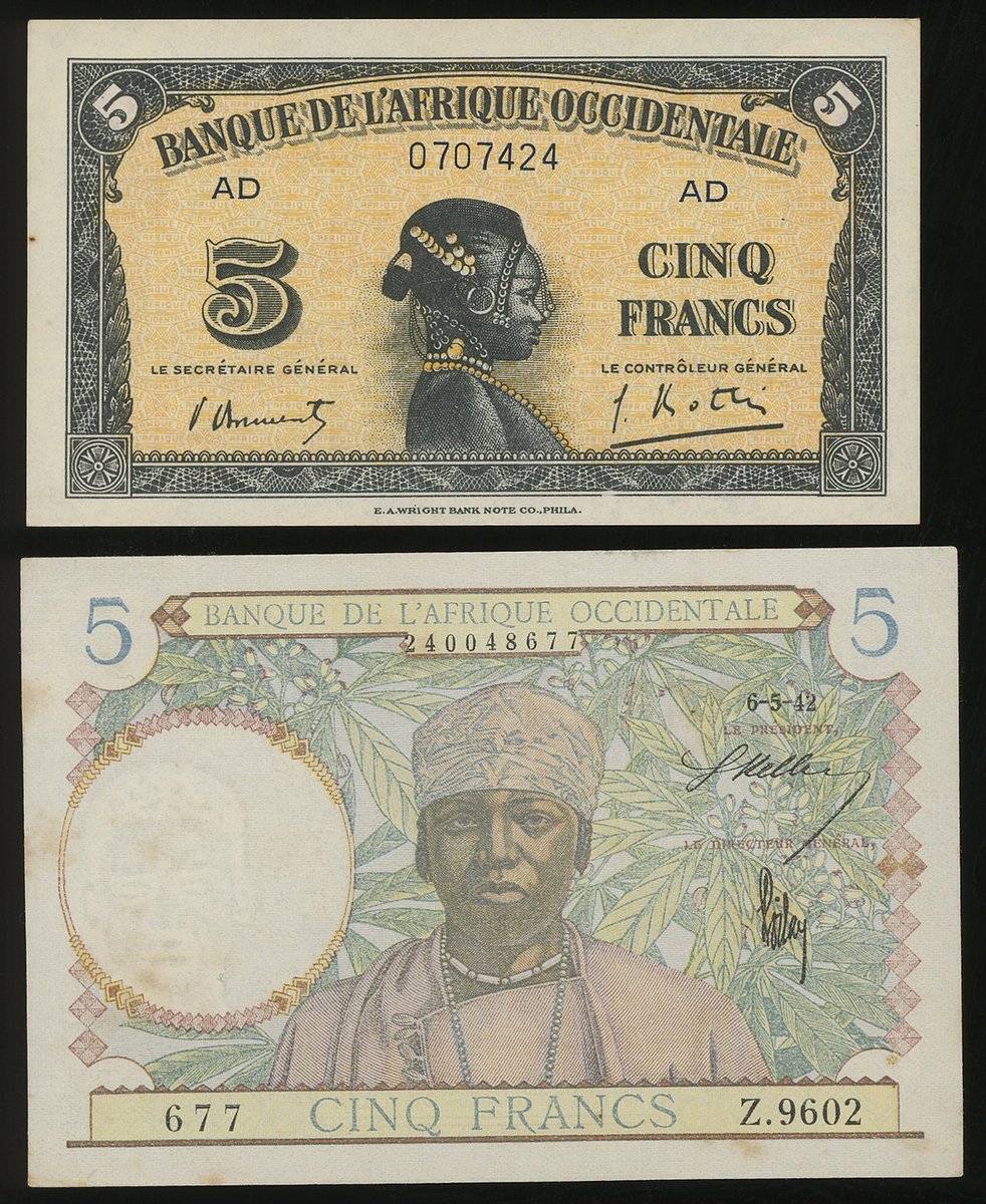 1942年法屬西非5法朗一對,編號AD 0707424 及 Z.9602 677,UNC,有黃及鏽潰