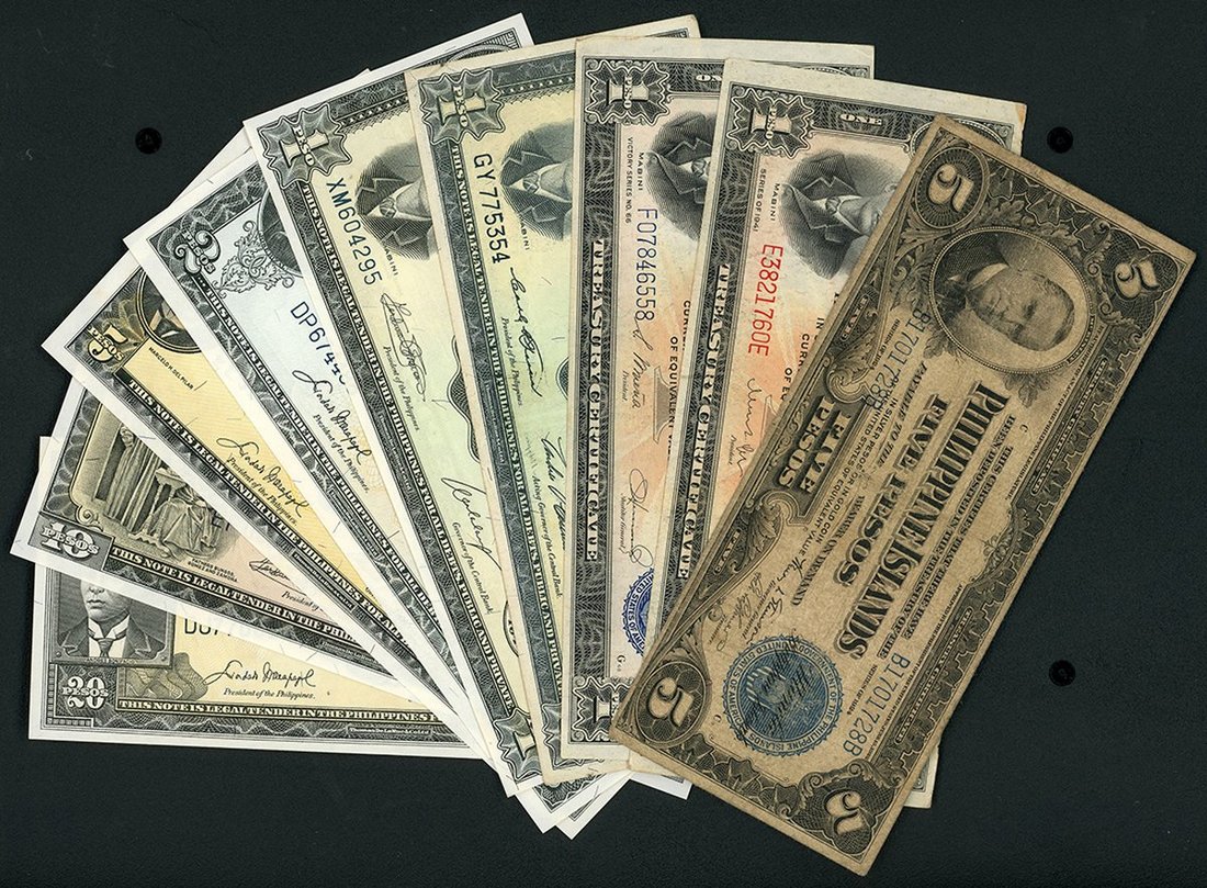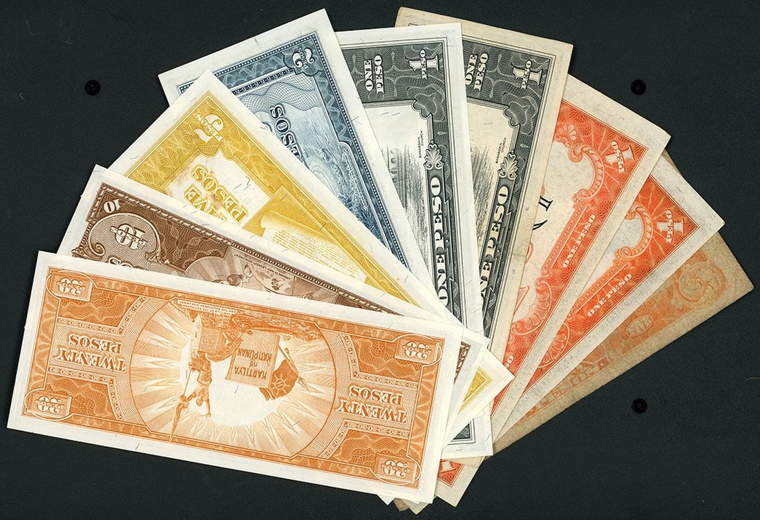 Philippines, group of 9 notes, including 5 pesos, 1924, 1 peso, 1941, 1 peso, victory series no. 66, and 1 (2), 2, 5, 10 and 20 pesos, series of 1949,