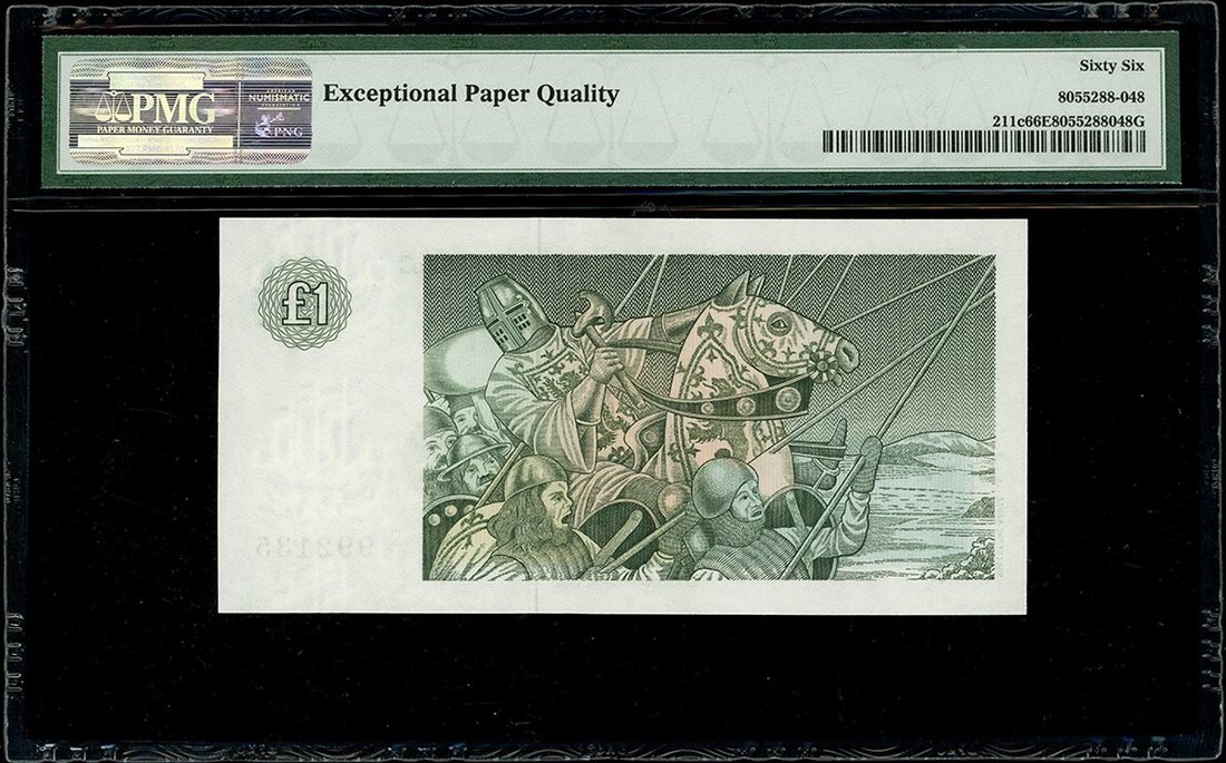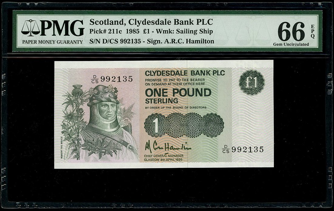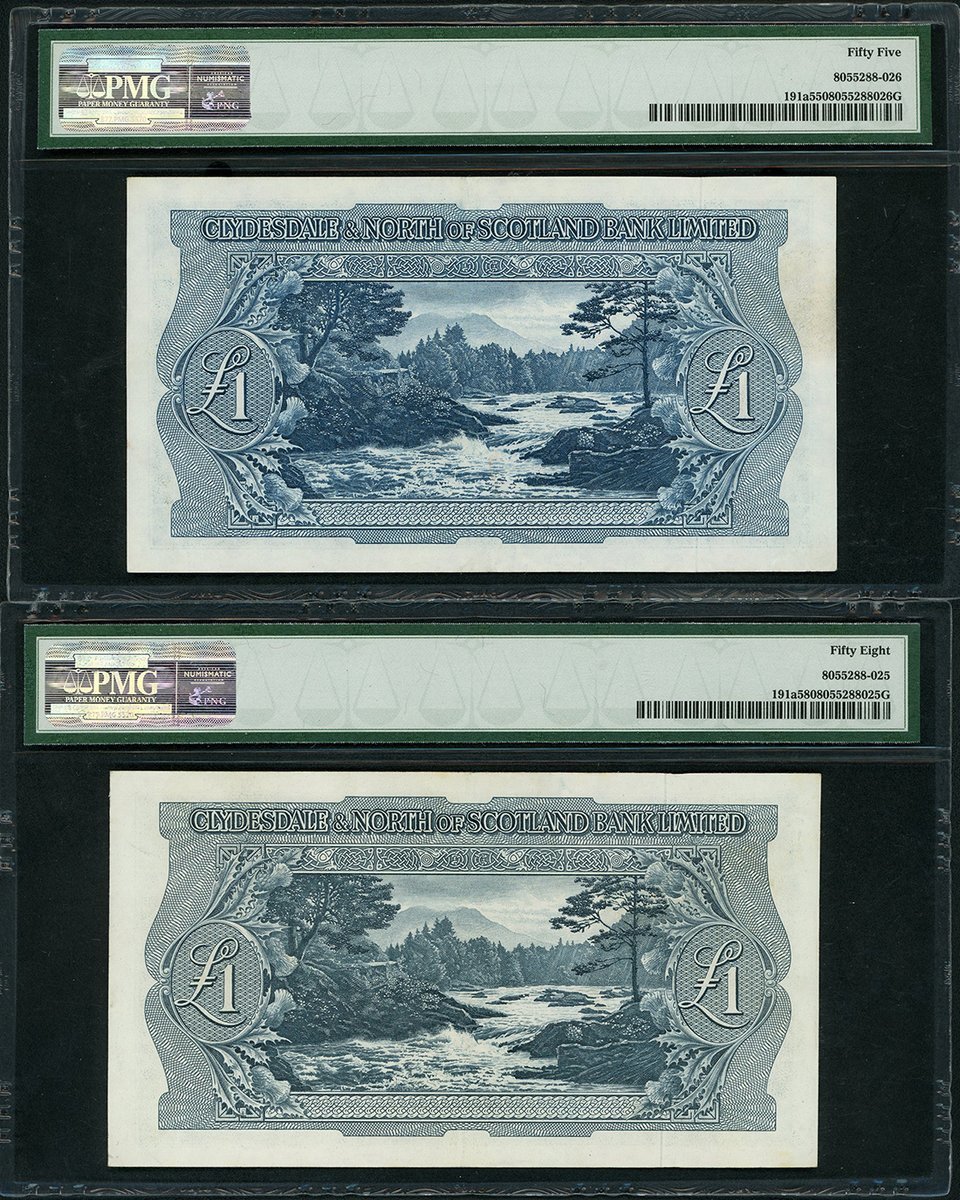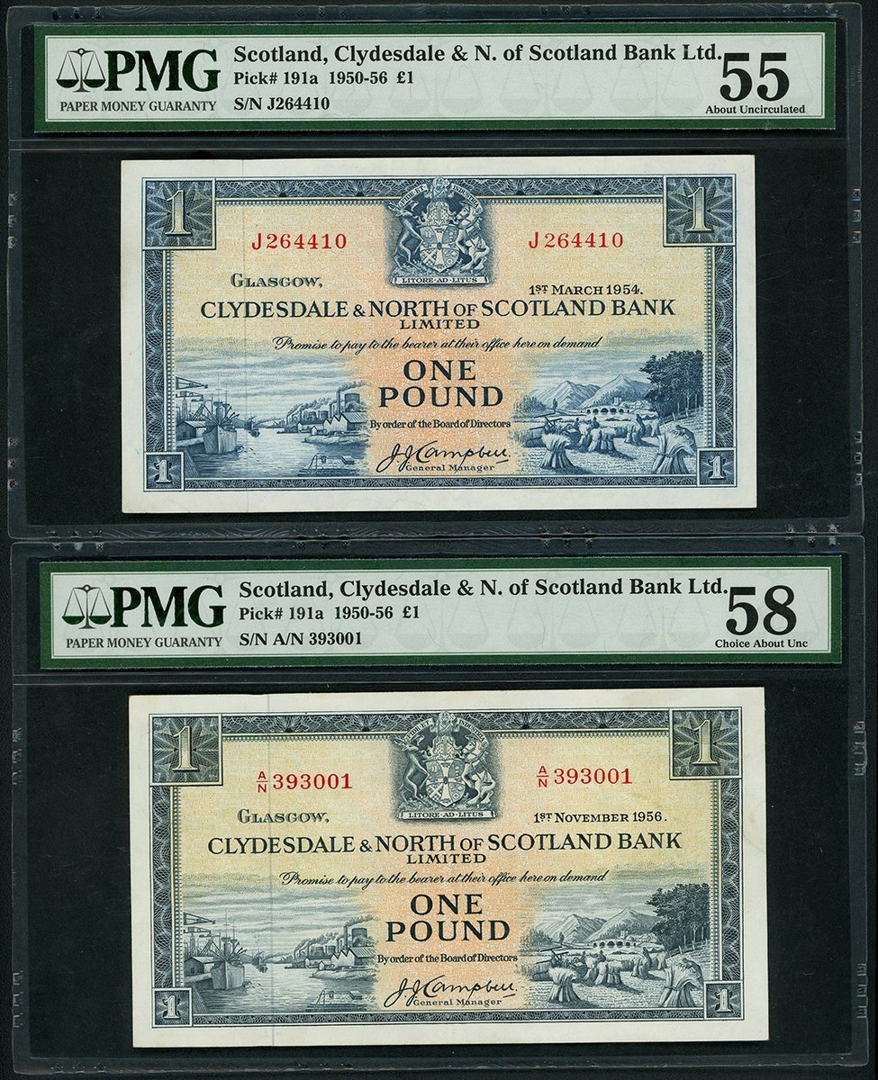 1954年及1956年克萊茲戴爾及北蘇格蘭銀行1鎊,編號J264410 及 A/N 393001,及1985年克萊茲戴爾銀行1鎊,編號D/CS 992135,評PMG 55、58及66EPQ