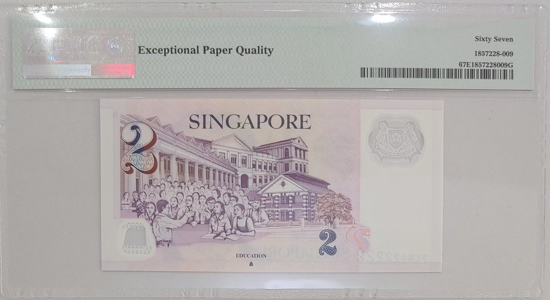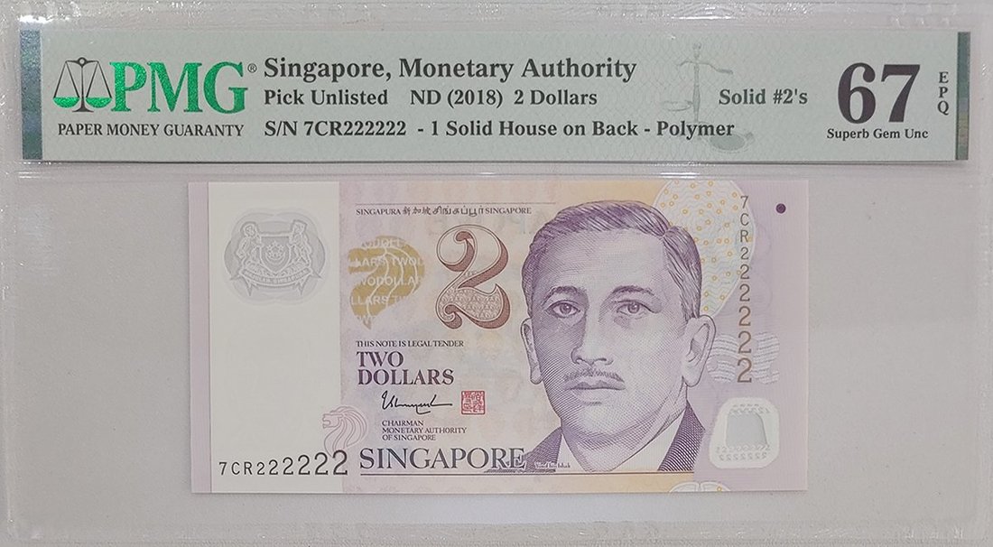 Singapore, $2, ND(2018), solid serial number 7CR222222, polymer, (Pick unlisted), PMG 67EPQ superb gem uncirculated.