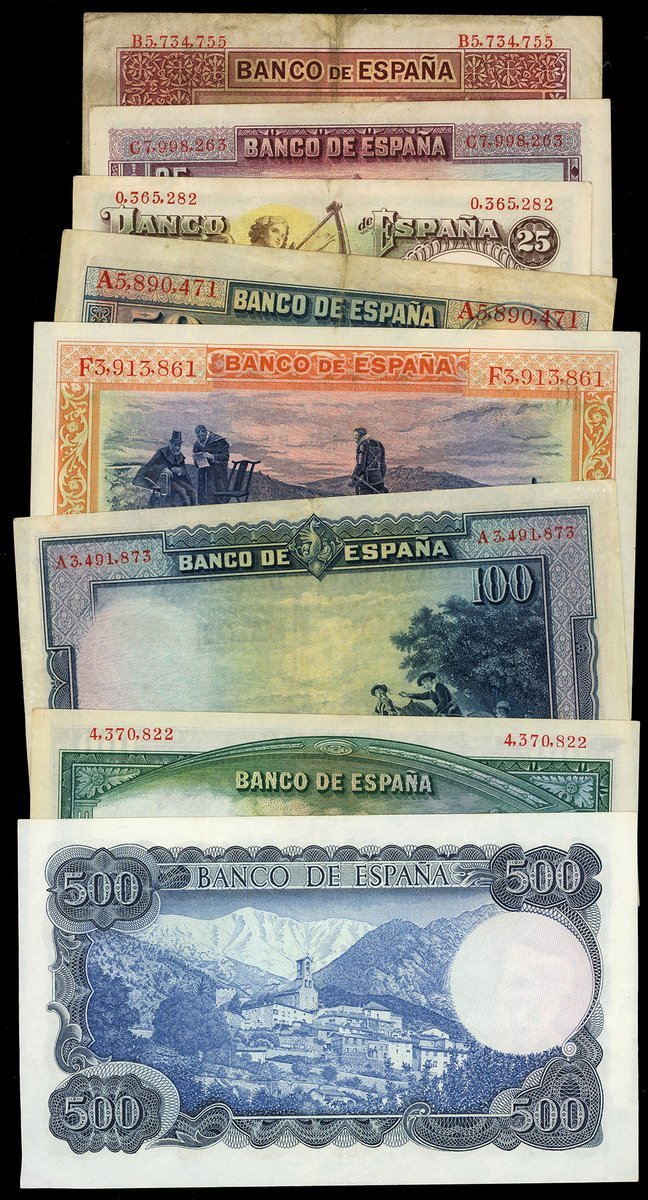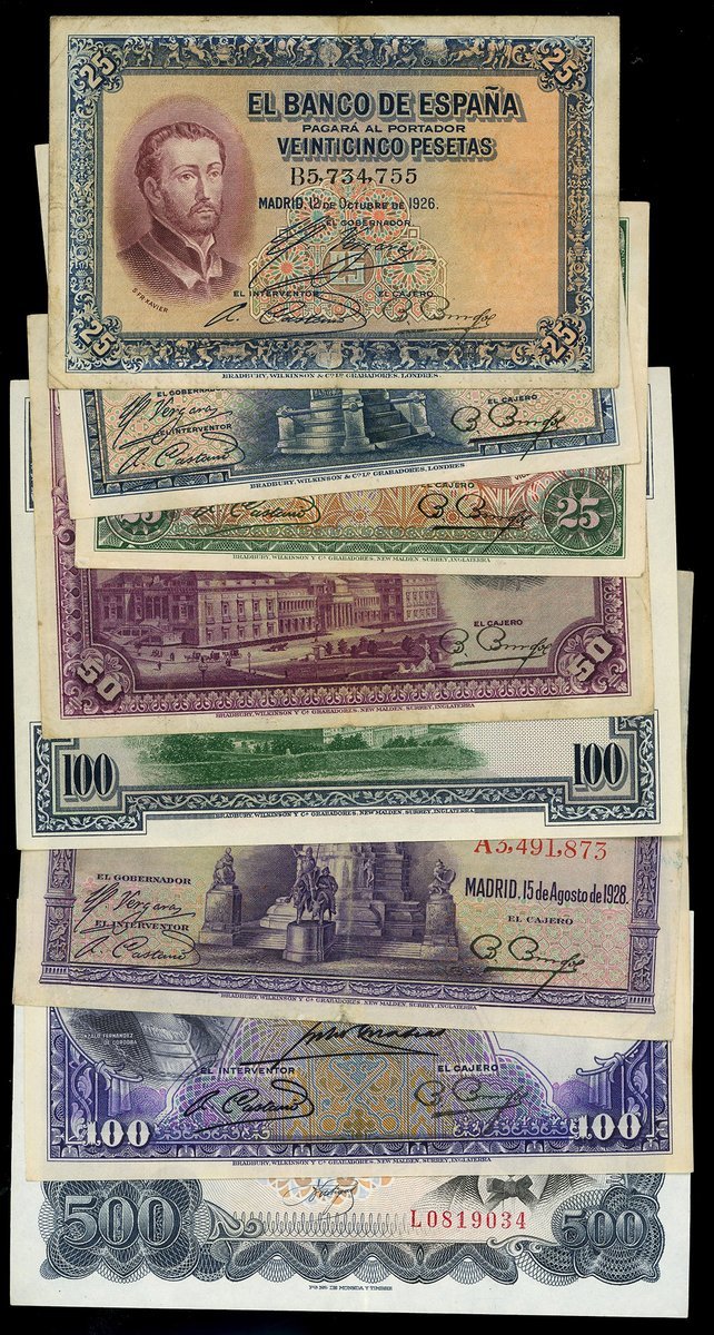 Banco de Espana, group of 8, consisting of 3x 25 Pesetas, 1926, 1928 and 1931, 1x 50 Pesetas, 1928, 3x 100 Pesetas, 1925, 1928 and 1931, and 500 Pesetas, 1971, (Pick 71a, 74b, 81, 75a, 69c, 76a, 83, 153a), about very fine to about uncirculated (8)