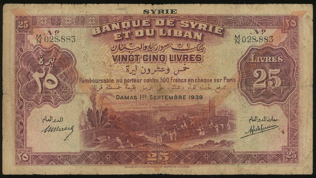 Banque de Syrie et du Liban, Syria, 25 livres, 1 September 1939, serial number M/N028883, brown-lilac and multicolour, caravan at centre,