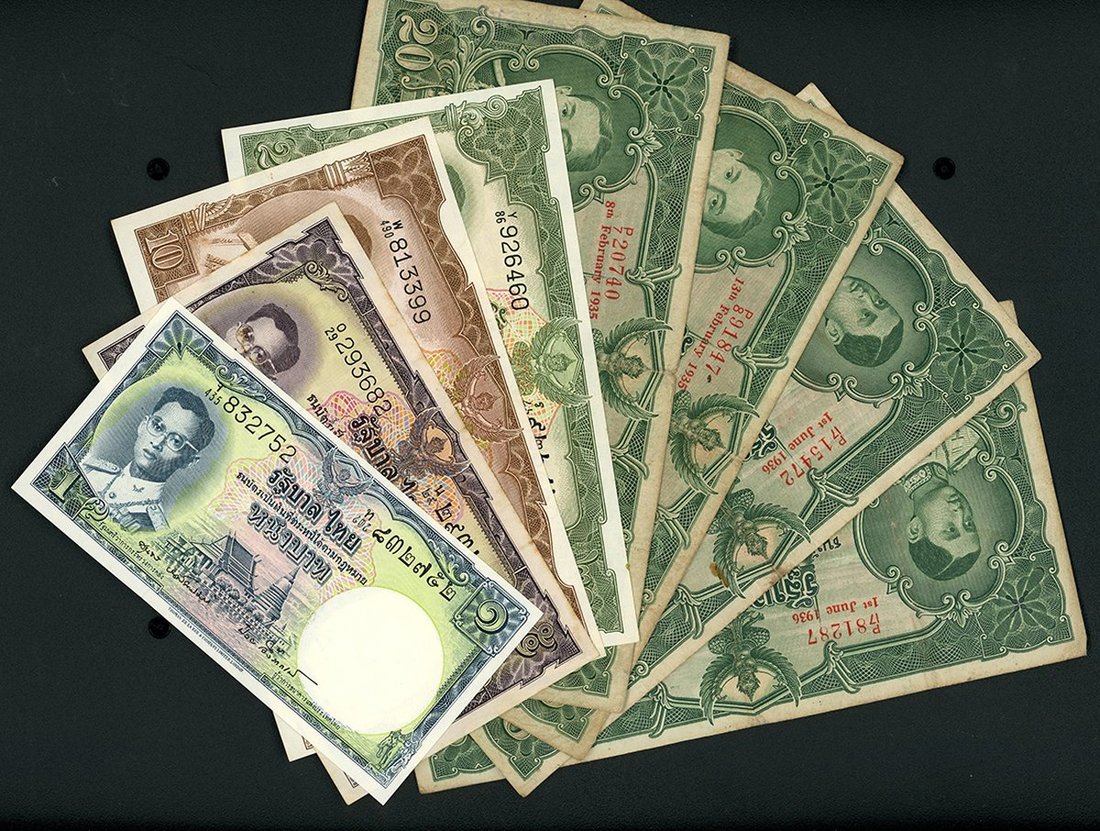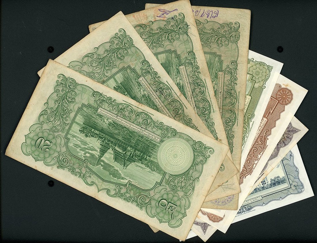 泰國紙鈔一組8枚,包括1935-36年20銖4枚,1950年代1, 5, 10及20銖,29銖AF至VF,其餘AU