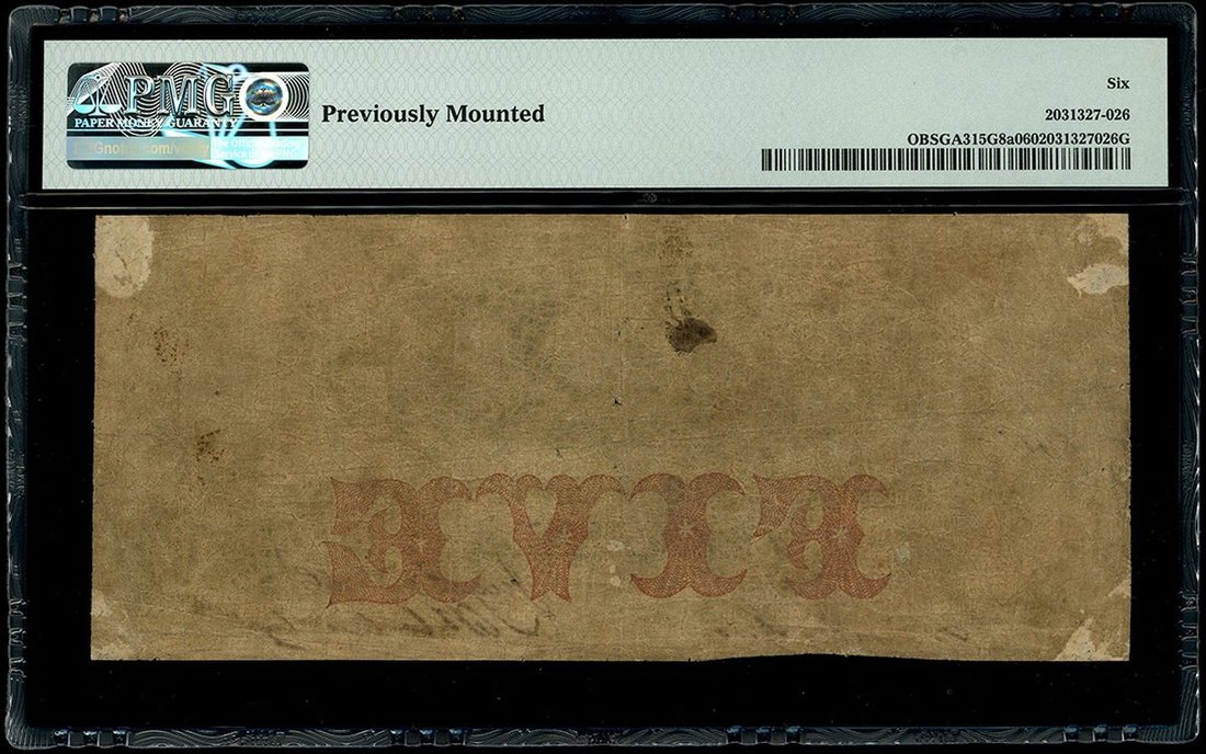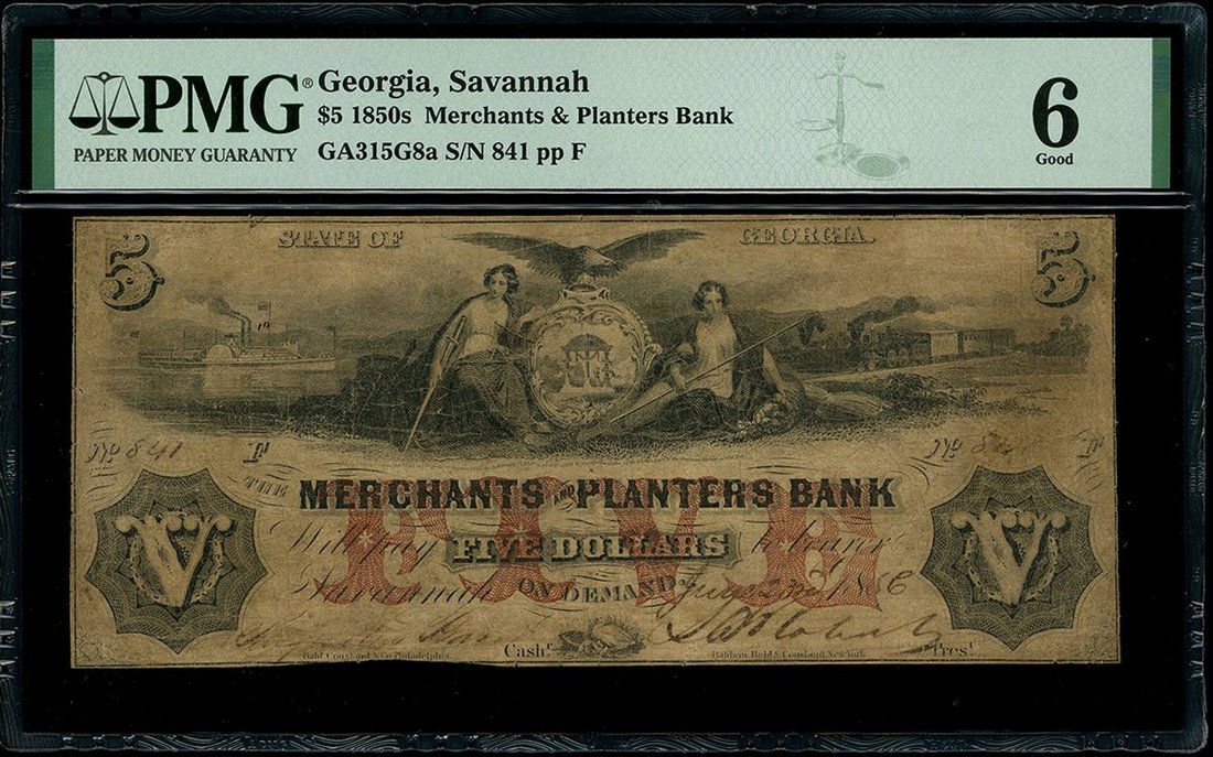 The Merchants and Planters Bank, $5, Georgia, 23.7.1856, serial number 841, PMG 6 Good (Previously Mounted)