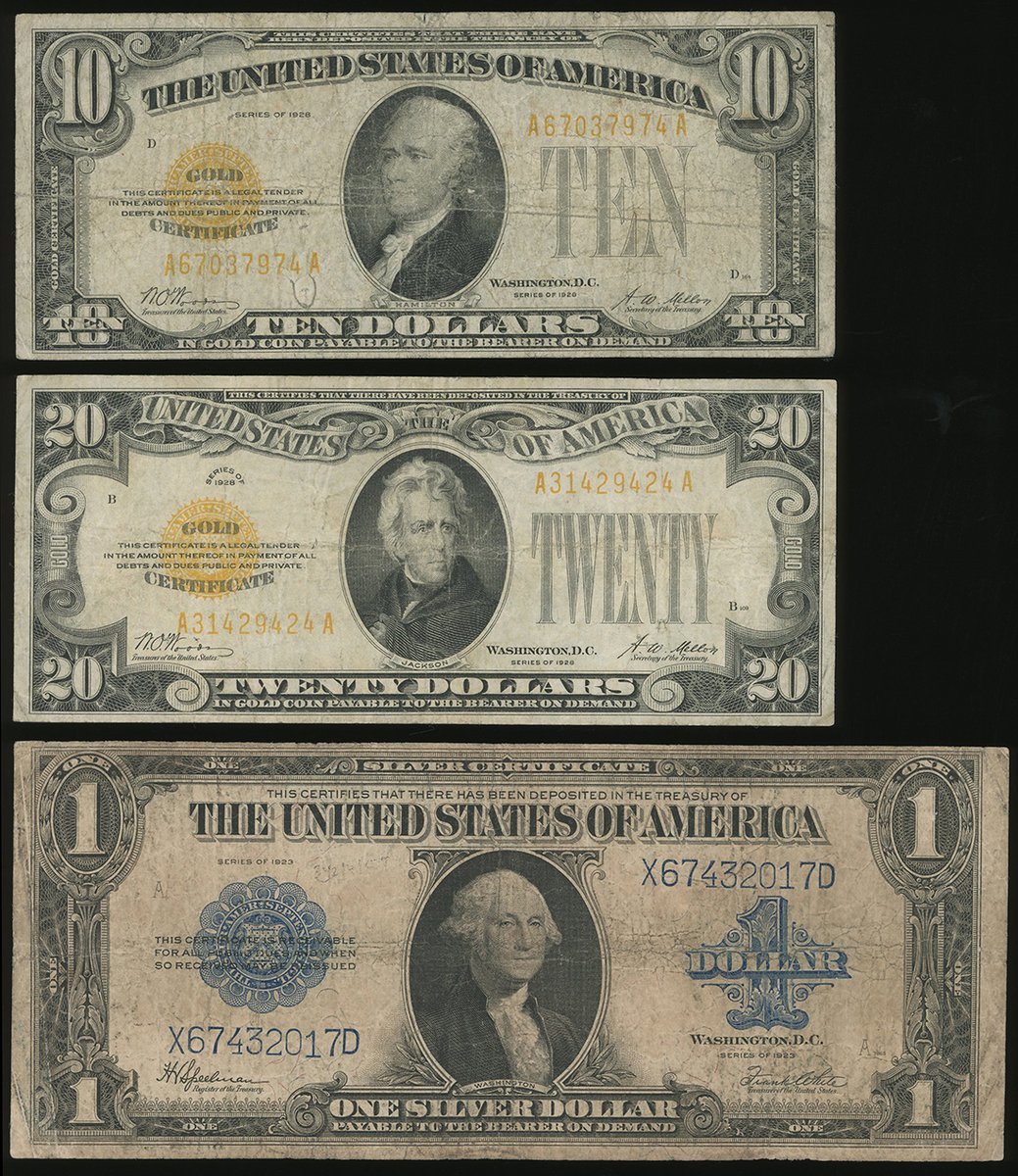 United States, group of 3, consisting of Gold Certificate $10 and $20, 1928, serial number A67037974A and A31429424A, yellow seal, also Silver Certificate $1, 1923, serial number X67432017D, blue seal,