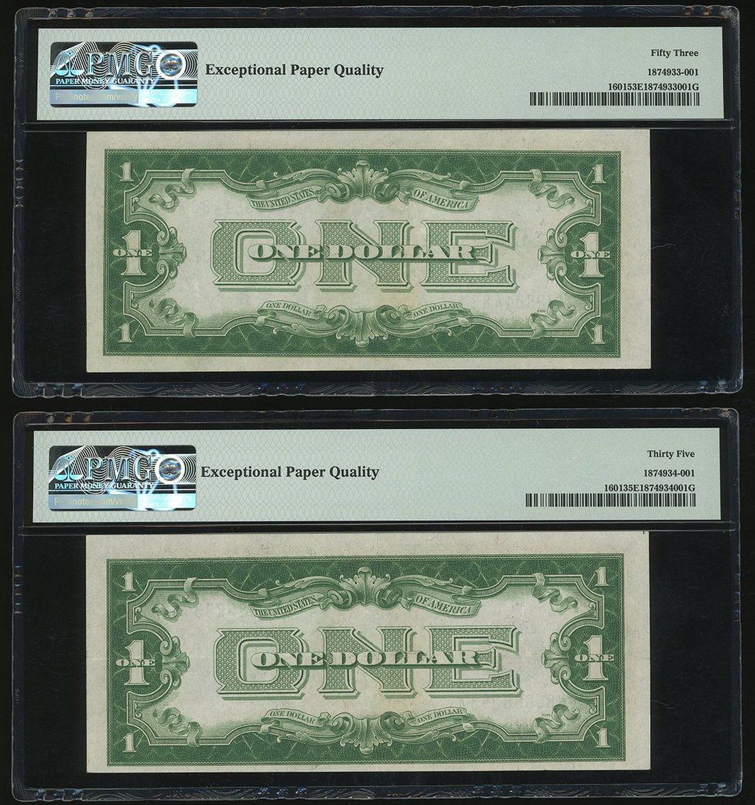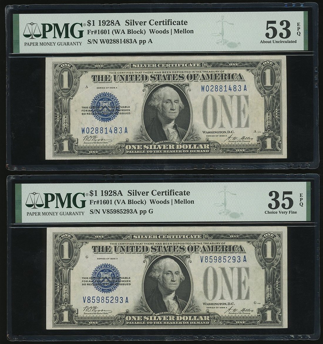 1928A美國銀元券1元一對,編號W02881483A 及 V85985293A,分別PMG 53EPQ及35EPQ