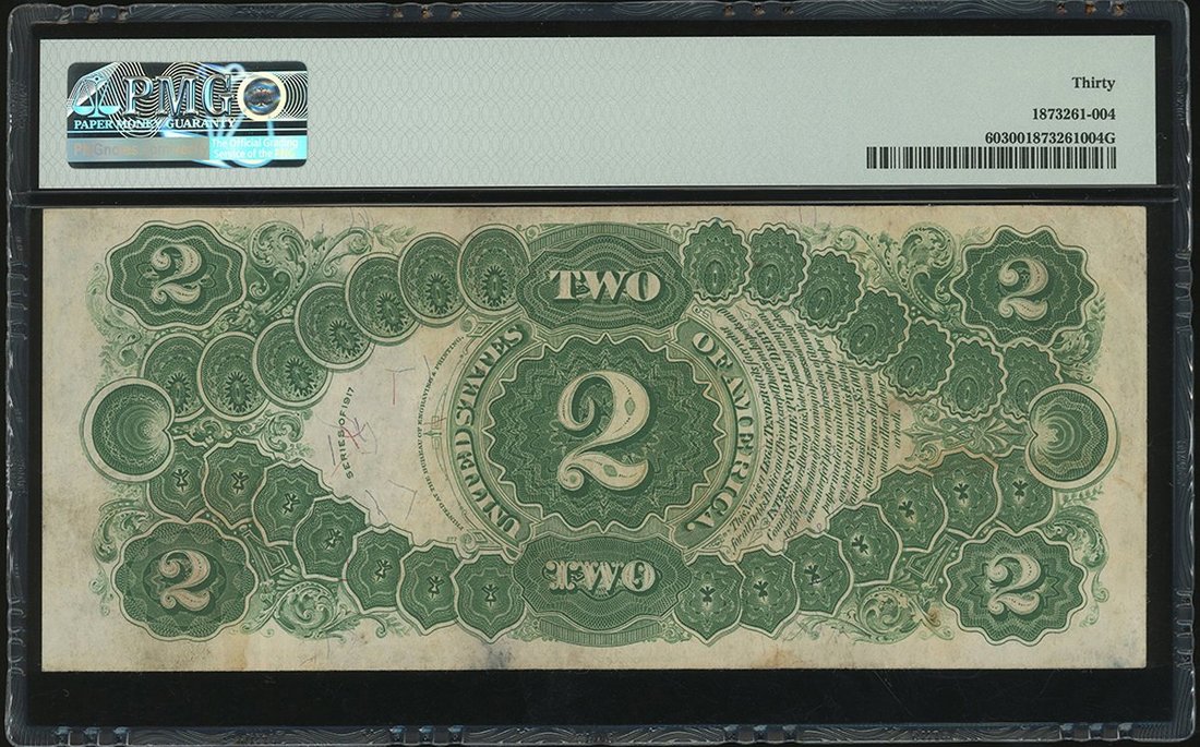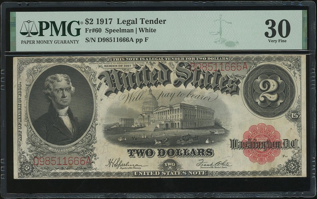 1917年美國美國券2元,編號D98511666A,紅印,PMG 30