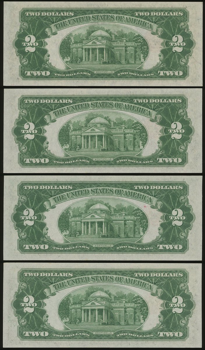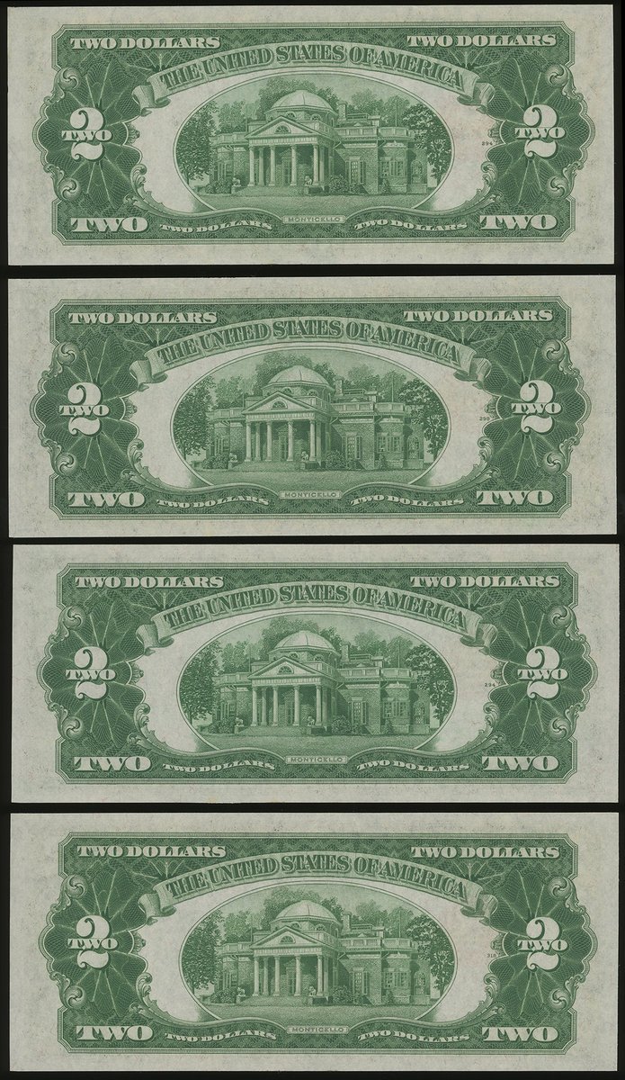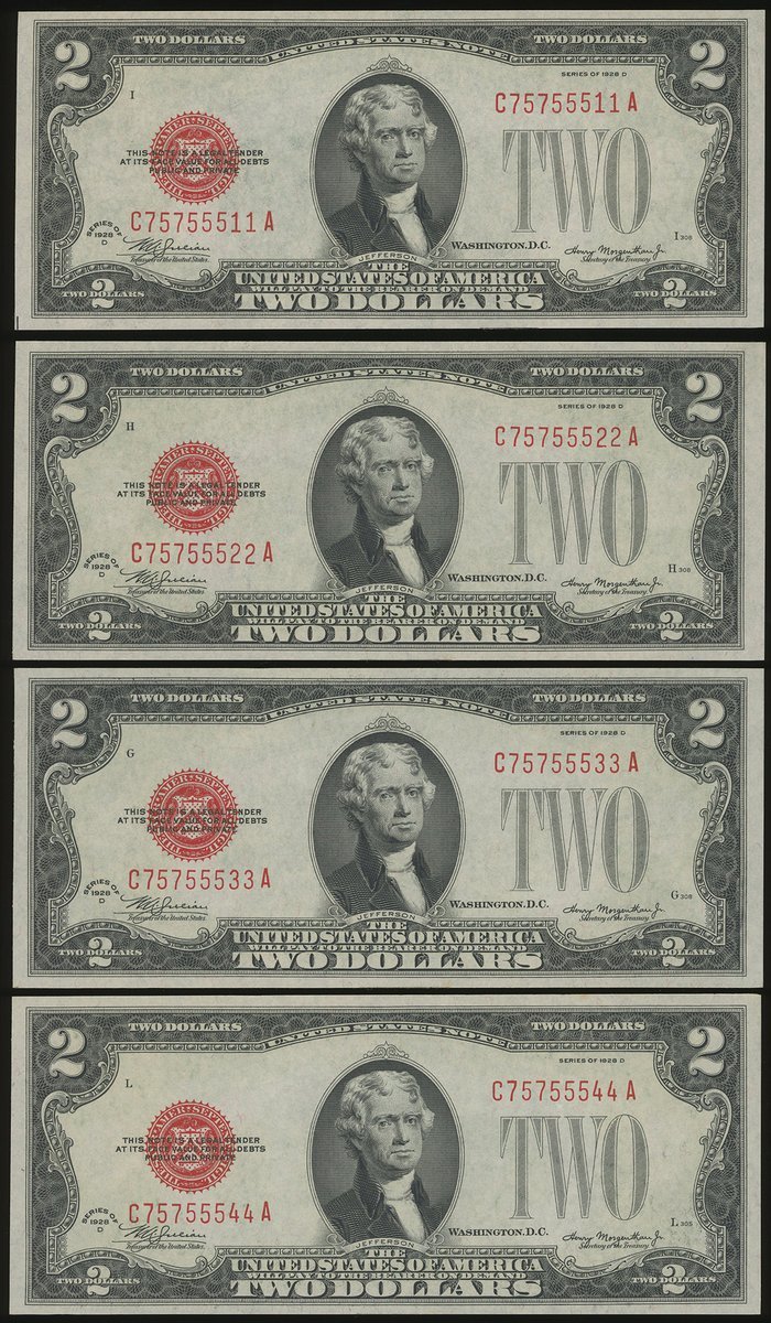 1928D美國美國券2元趣味號10枚,編號C75755511A, 522A, 533A, 544A, 555A, 566A, 577A, 588A, 599A 及 600A,紅印,AU至UNC,有微黃