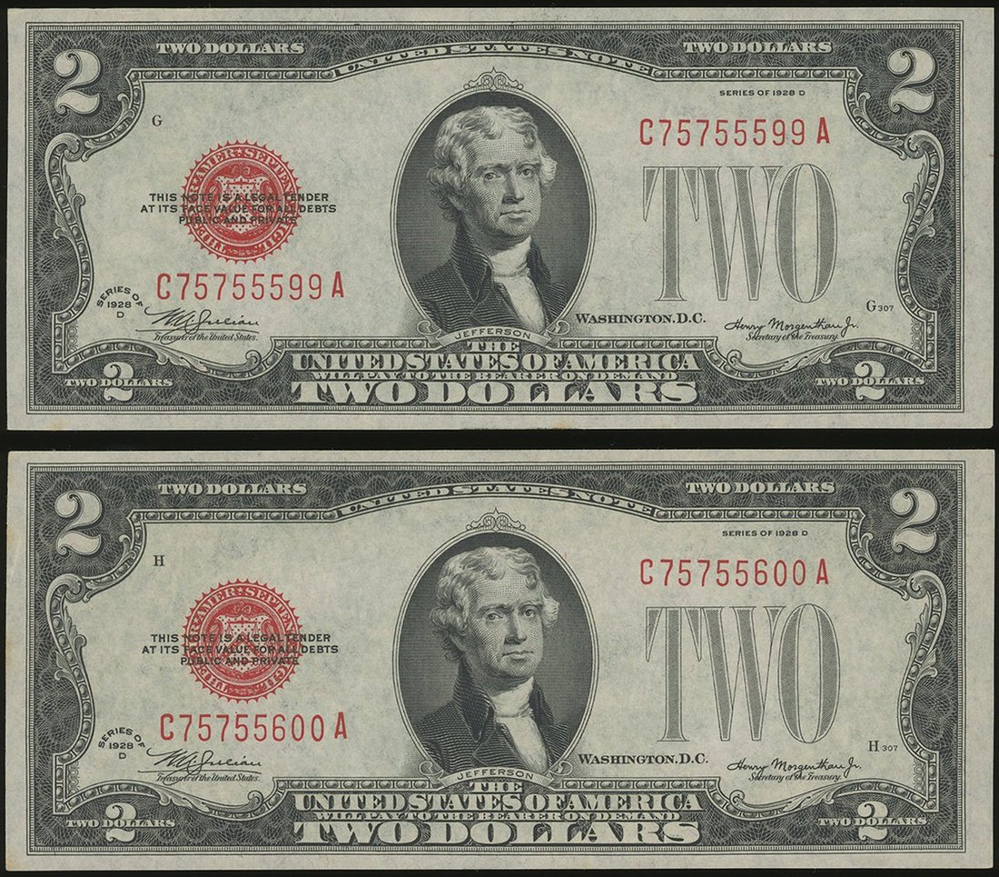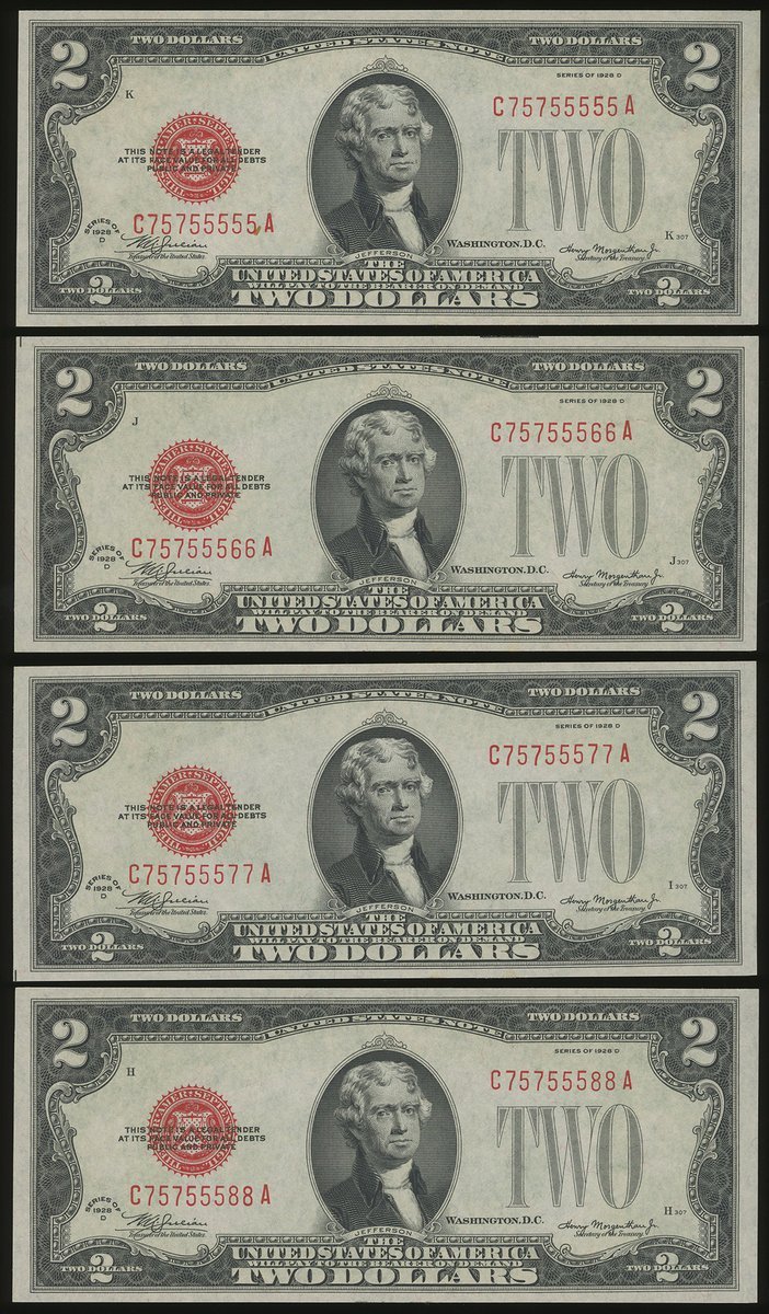 United States, United States Note, 10x $2, 1928D, fancy serial numbers C75755511A, 522A, 533A, 544A, 555A, 566A, 577A, 588A, 599A and 600A, red seal, signed by Julian & Morgenthau,