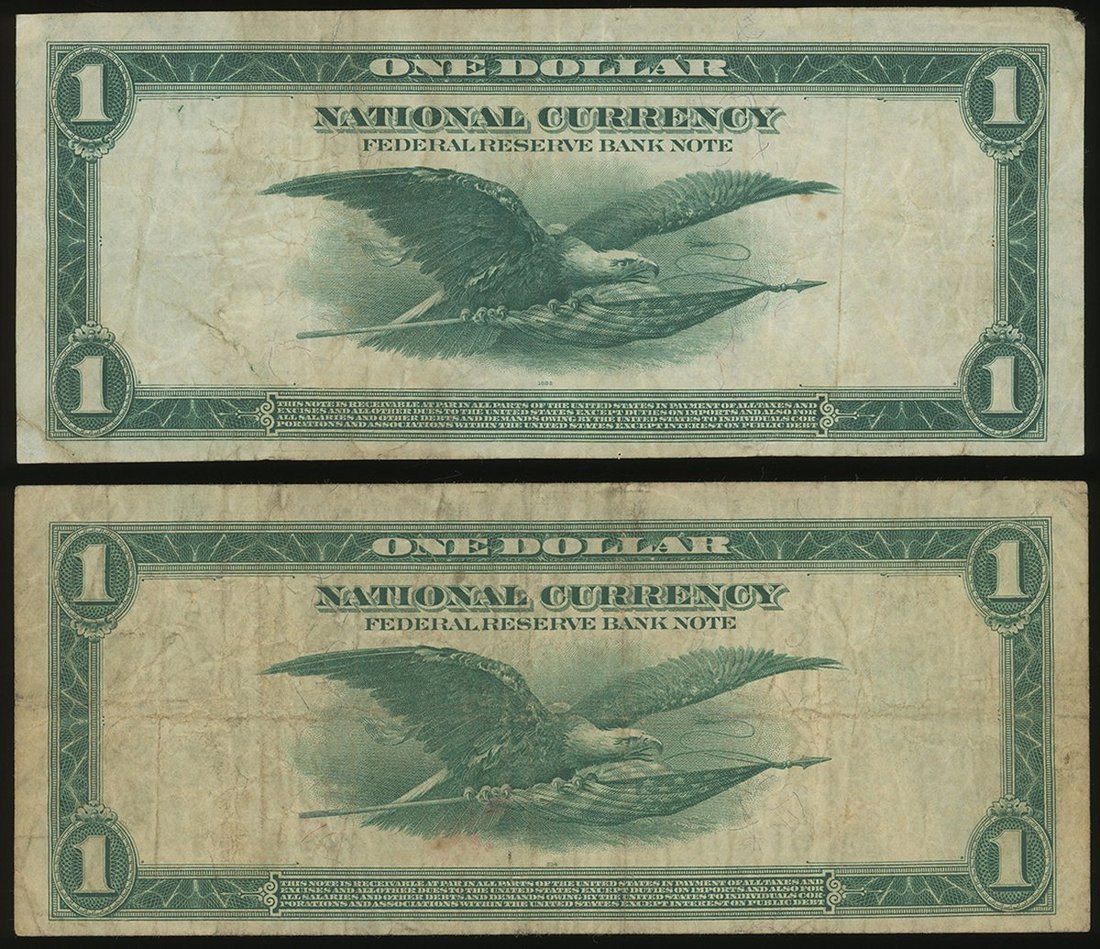 United States, National Currency Federal Reserve Banknote, a pair of $1, 1918, serial number B34018165A and J20465767A, blue seal, New York and Kansas City issues,
