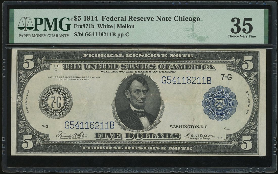 United States, Federal Reserve Note, $5, 1914, serial number G54116211B, blue seal, Chicago issue, signed by White and Mellon,