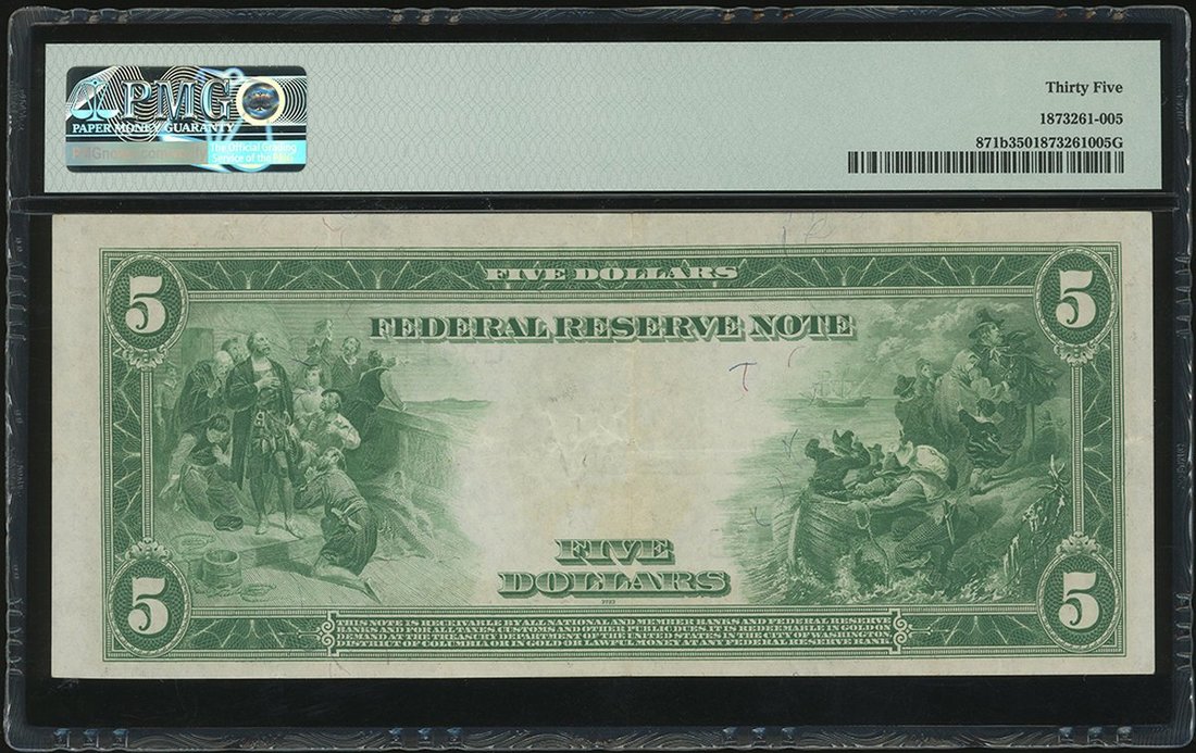 1914年美國聯邦儲備券5元,編號G54116211B,藍印,芝加哥發行,PMG 35