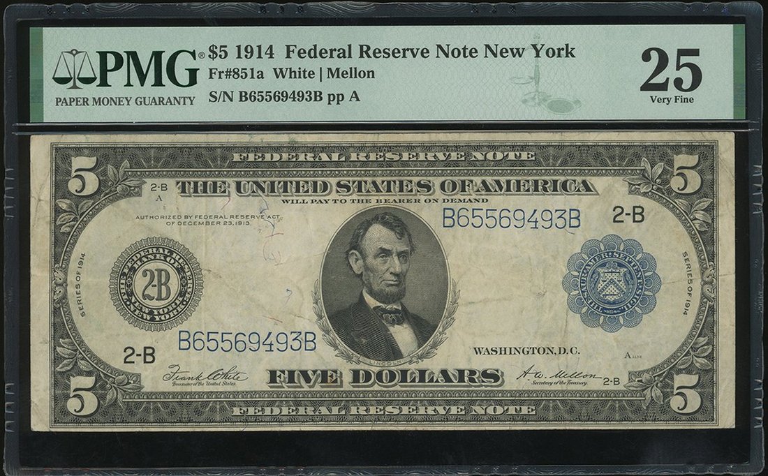United States, Federal Reserve Note, $5, 1914, serial number B65569493B, blue seal, New York issue, signed by White and Mellon,