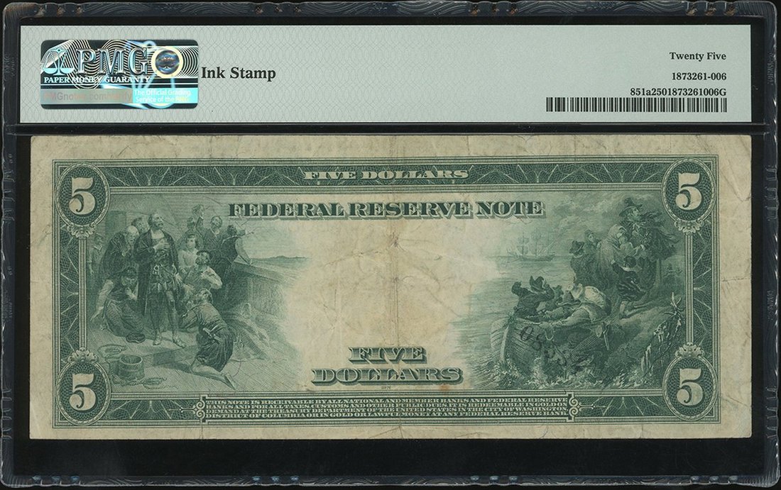 1914年美國聯邦儲備券5元,編號B65569493B,藍印,紐約發行,PMG 25,有墨漬