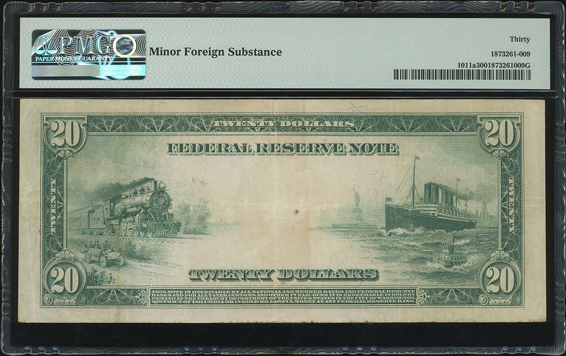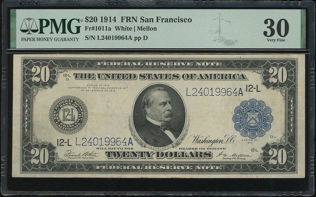 1914年美國聯邦儲備券20元,編號 L24019964A,藍印,三藩市發行,PMG 30,輕微黏附物