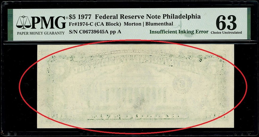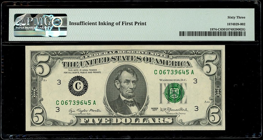 The United States of America, Federal Reserve Note, $5, 1977, ERROR NOTE, serial number C06739645A, reverse print missing, (Pick 463a), PMG 63 Choice Uncirculated (Insufficient Inking of First Print)
