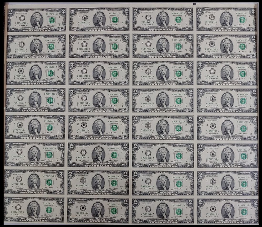United States, Federal Reserve Note, an uncut sheet of 32x $2, 2009, (Pick 530A), about uncirculated to uncirculated, edge creases, in carboard tube holder (1 uncut sheet)