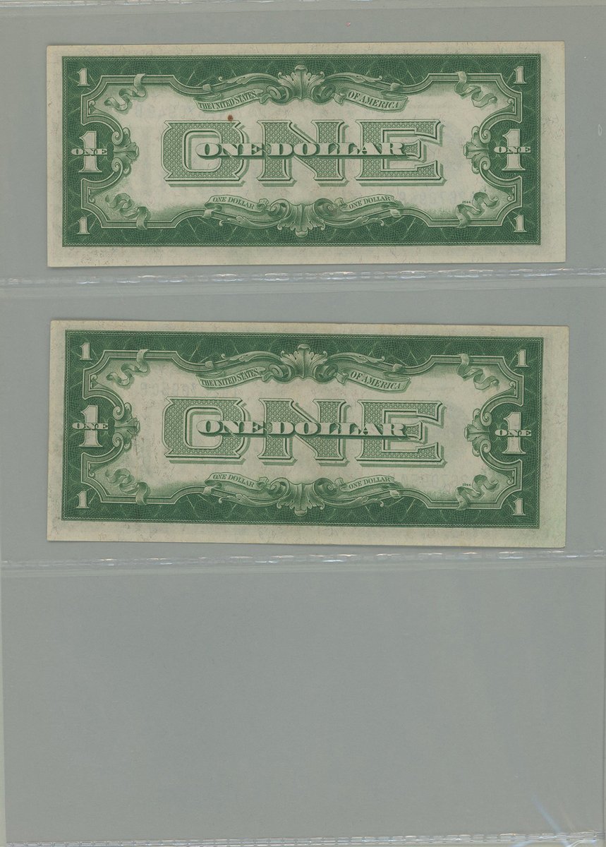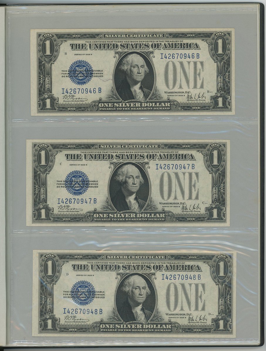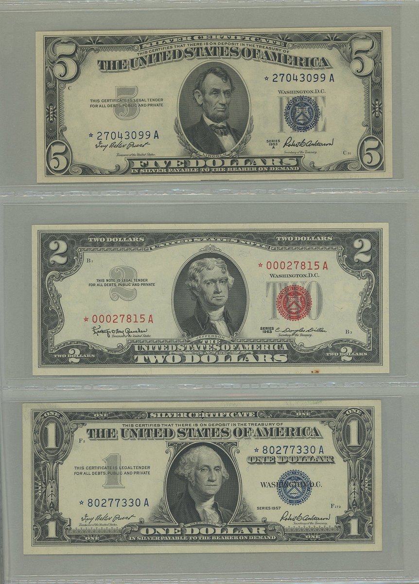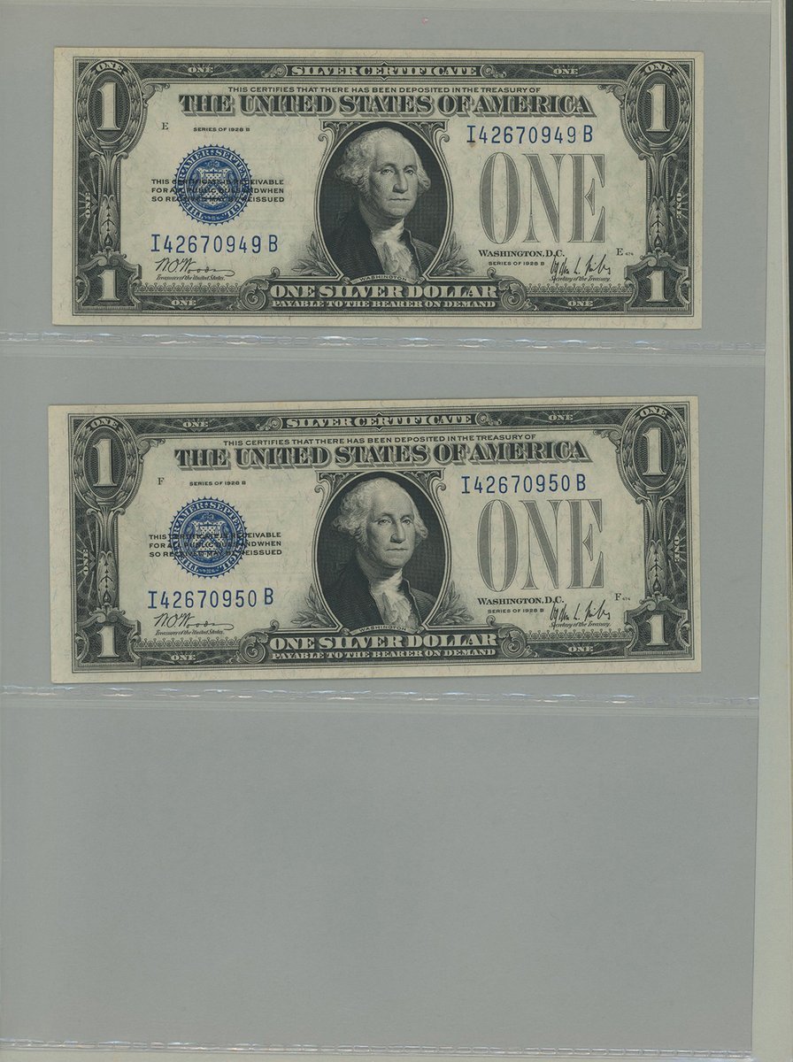 United States, group of 11 kept in an album, consisting of: Silver Certificate, including 6x $1, 1928B (5) and 1957 (1), and 1x $5, 1953A, consecutive serials I42670946B-950B; United States Note, $2, 1963; also Federal Reserve Note, $2, 1976,