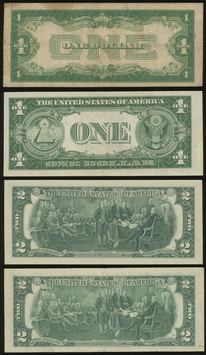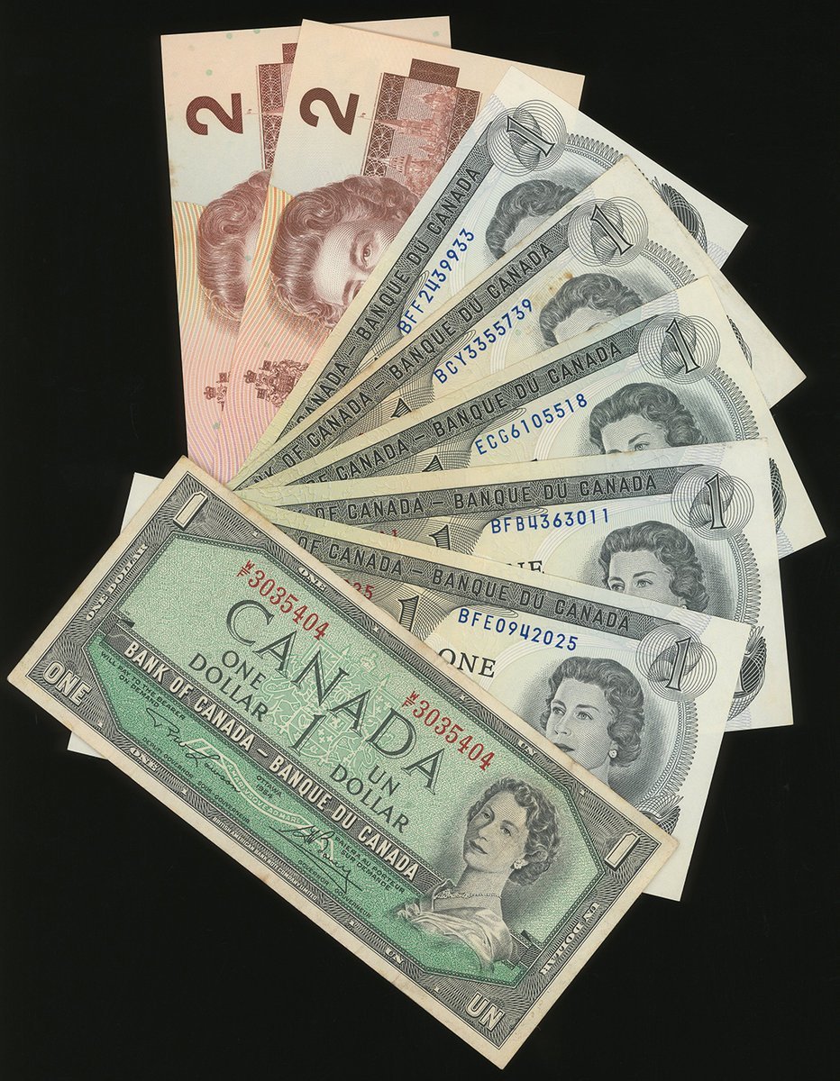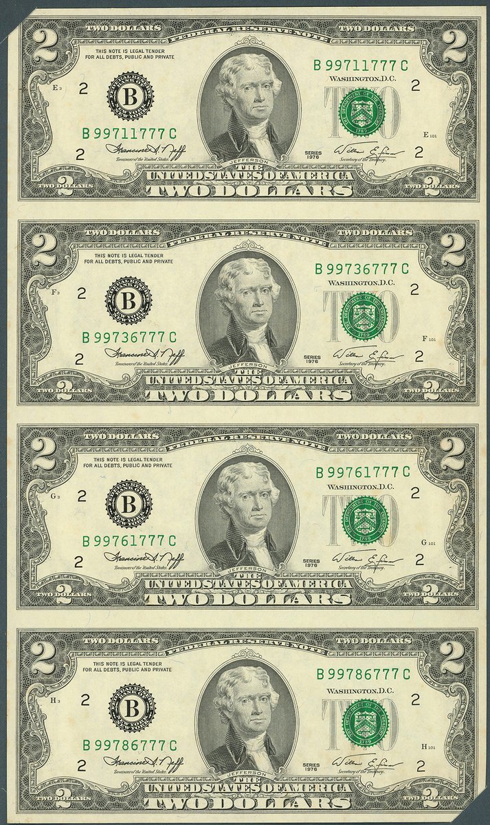 United States and Canada, group of 13 notes, including an uncut sheet of 4x $2, 1976 and two silver certificate $1's, 1928 and 1935,