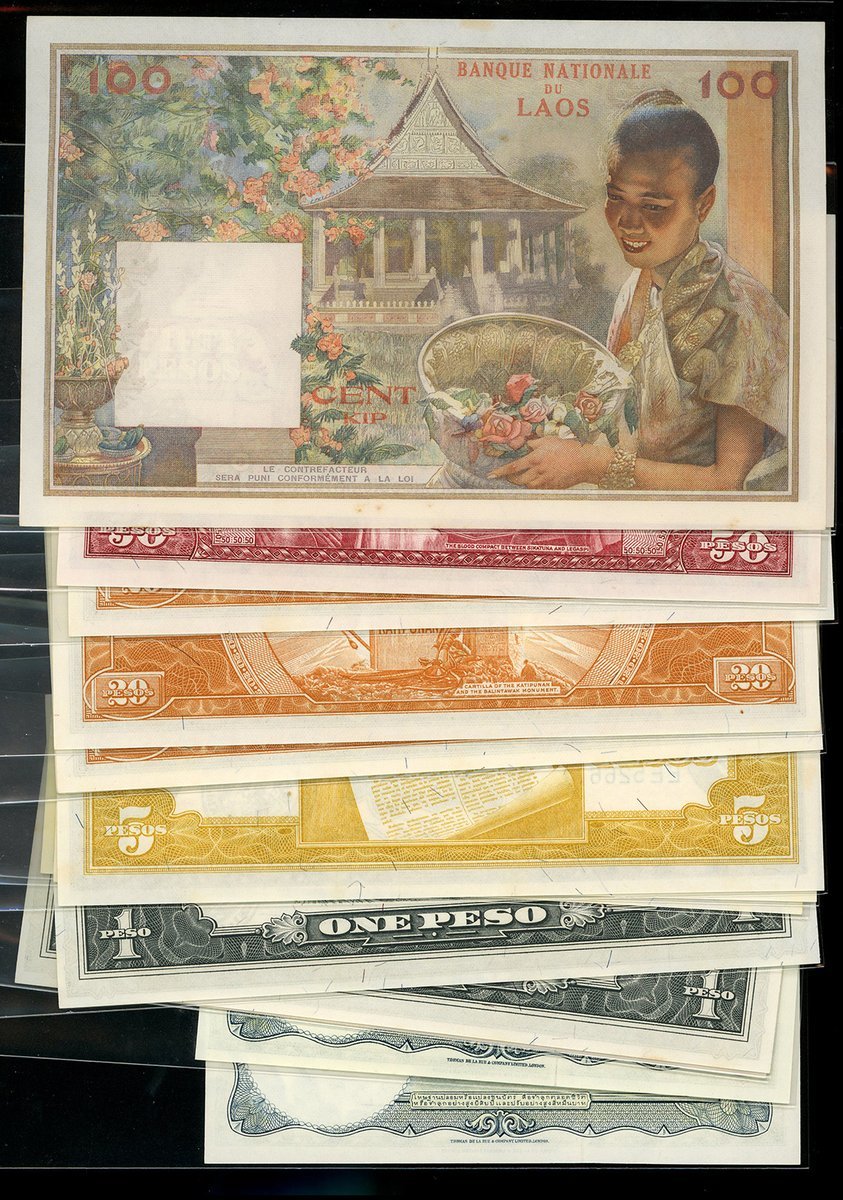 東南亞紙鈔一組15枚,泰國3枚、菲律賓11枚及老撾1枚,UNC